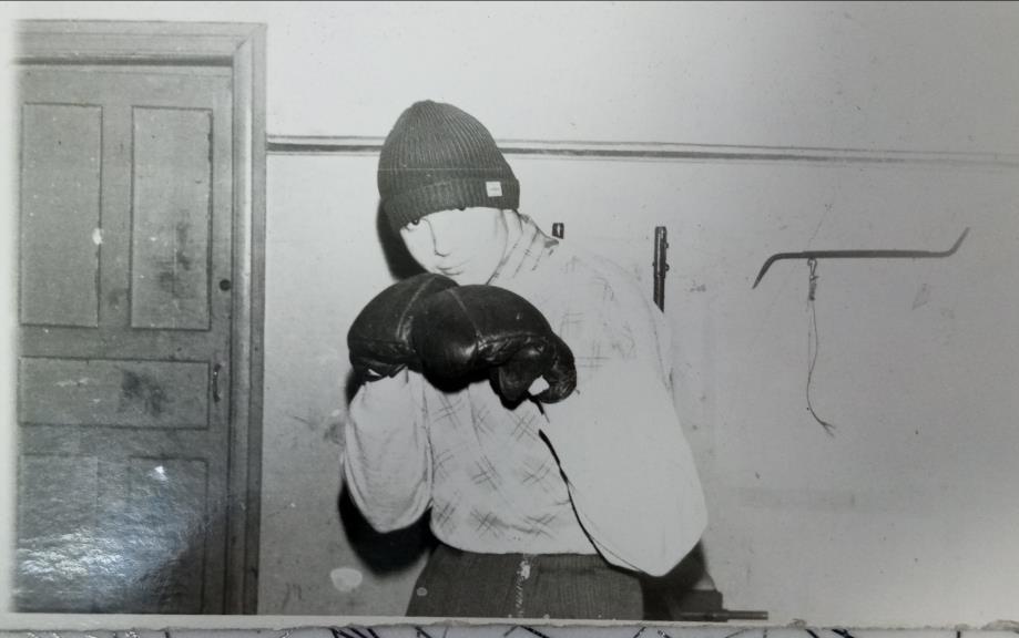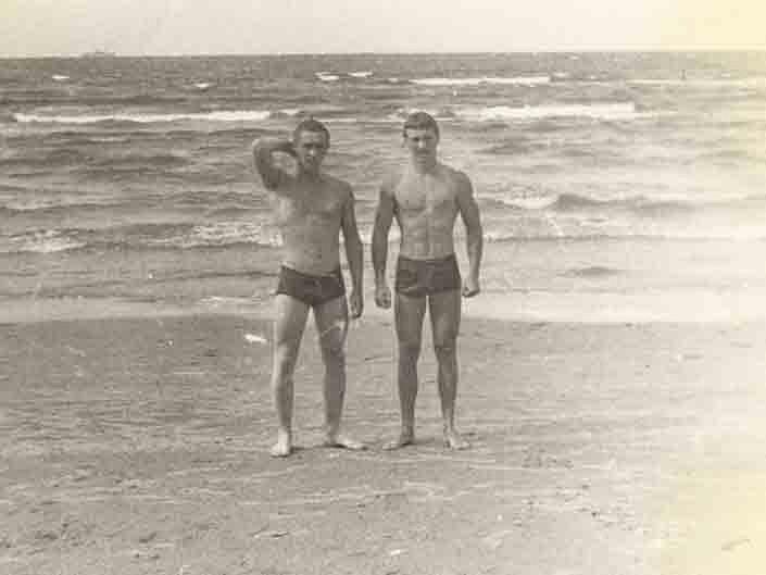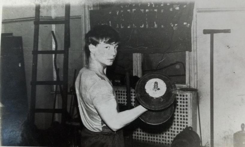 А вот здесь я как раз пытаюсь поднять штангу, чуть не лопнув от напряжения. У меня тогда была кликуха "Профессор", так как ходил в очках. Позже я стал "Сэменом". На штанге все те же блины из шлифовальных дисков. Здесь мне лет 16.