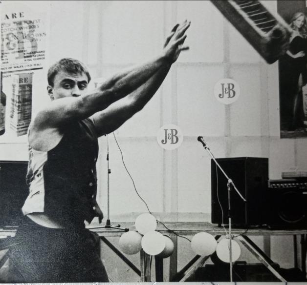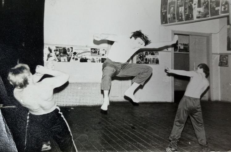 Снова таже троица, на отработка "китайской" техники из кинофильмов про Брюса Ли. Фотосессия идет в большом зале, где еще висят афиши советского кинопрома. Кино в клубе уже не показывают. Это эпоха видиков.
