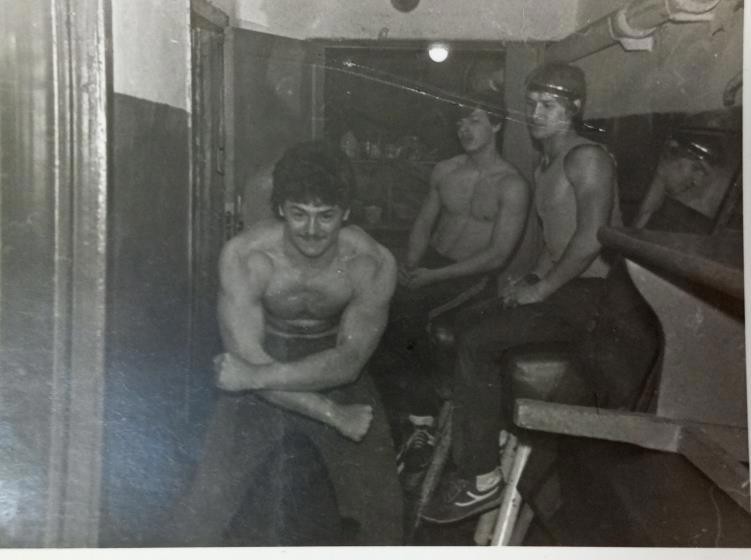 Еще один уникальный кадр. Колян, на переднем плане, Вовка "Шериф" и Андрюха "Монах". Фото сделано в раздевалке спортивного зала школы. До того, как нам удалось выбить зал в клубе.