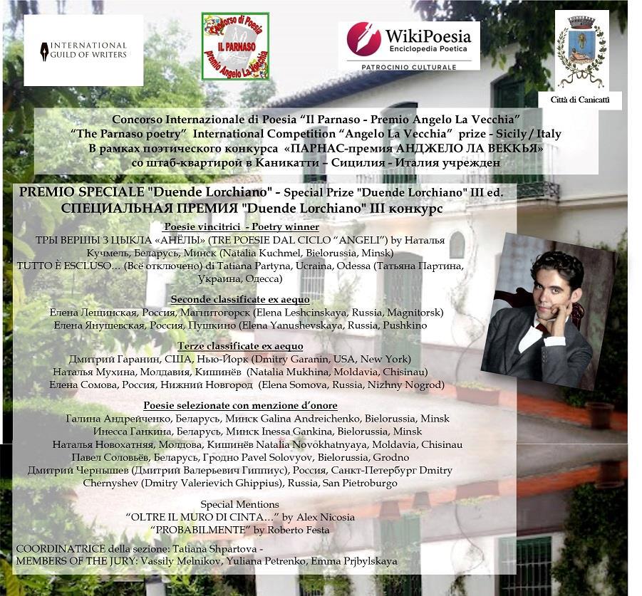 Автор: Елена ЛещинскаяВнезапно прилетела весть о серебре Специальной премии Duende Lorchiano (III ed.) в рамках поэтического конкурса «ПАРНАС — премия Анджело Ла Веккья» (Каникатти — Сицилия — Италия).
