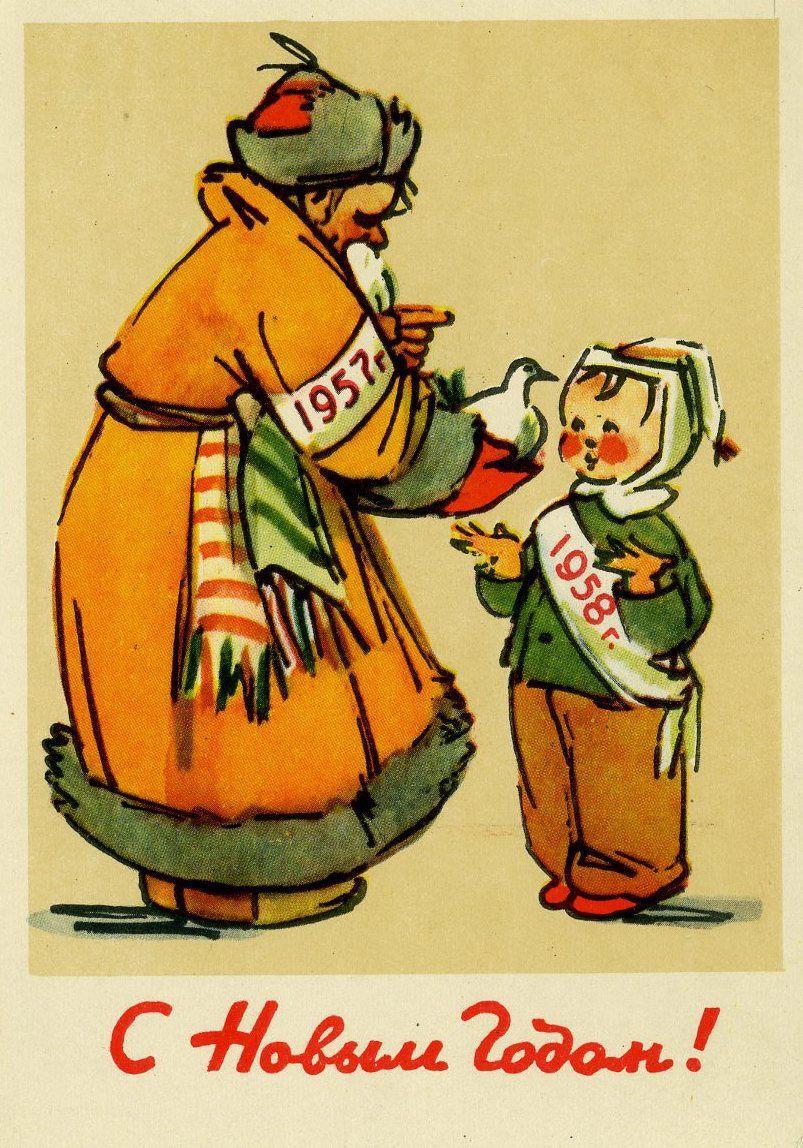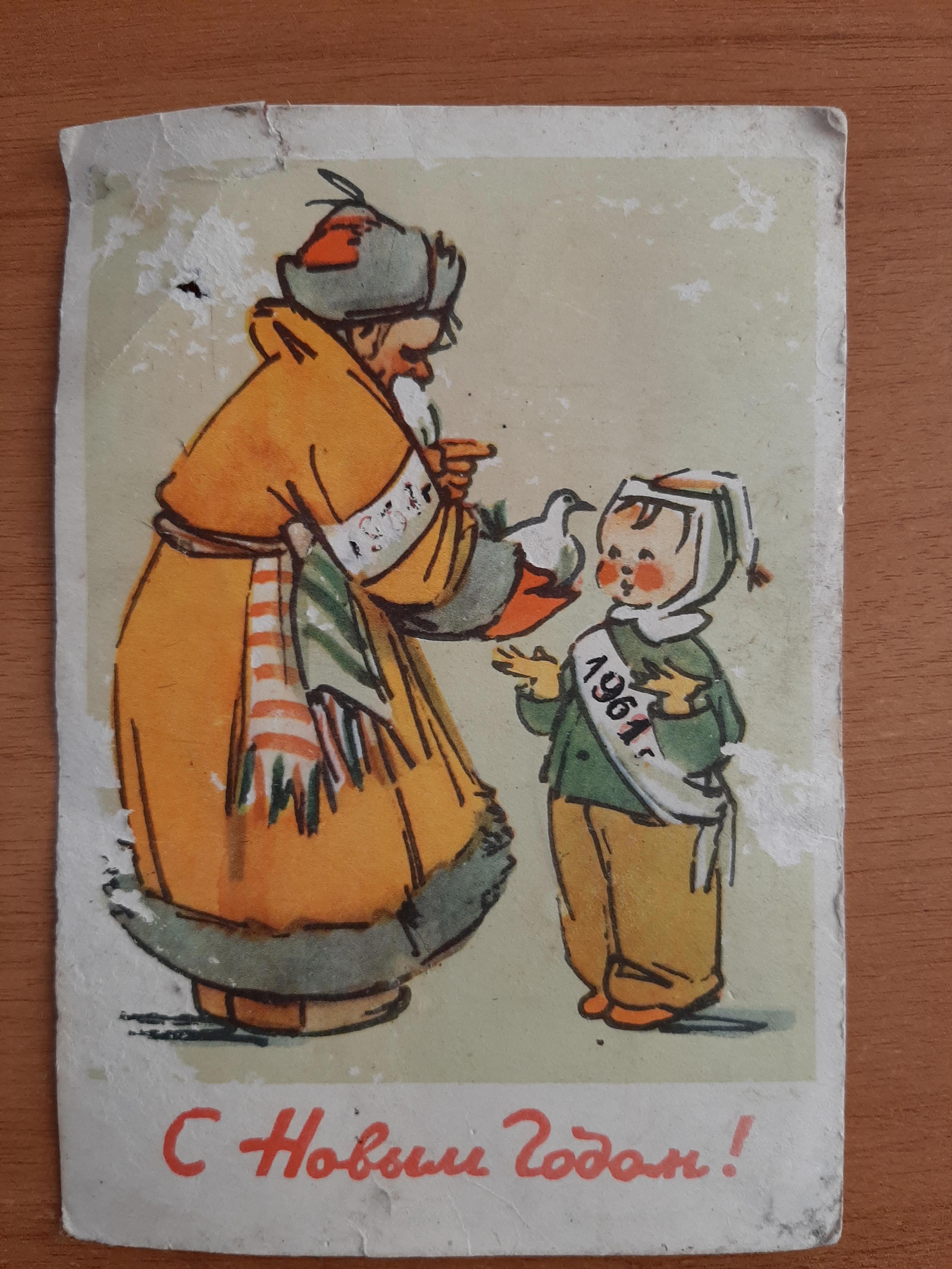 К чему я это всё? Да так, нашел в недавно открытку – прямо на улице, под ногами. Частный сектор, тротуар между оградами и мусорным контейнером. Затоптанный кусок картона, непонятно, зачем его подобрал. Потом уже разглядел рисунок: Дед Мороз, мальчуган Новый год, поздравление с 1961-м. Шестьдесят два года назад, соответственно.