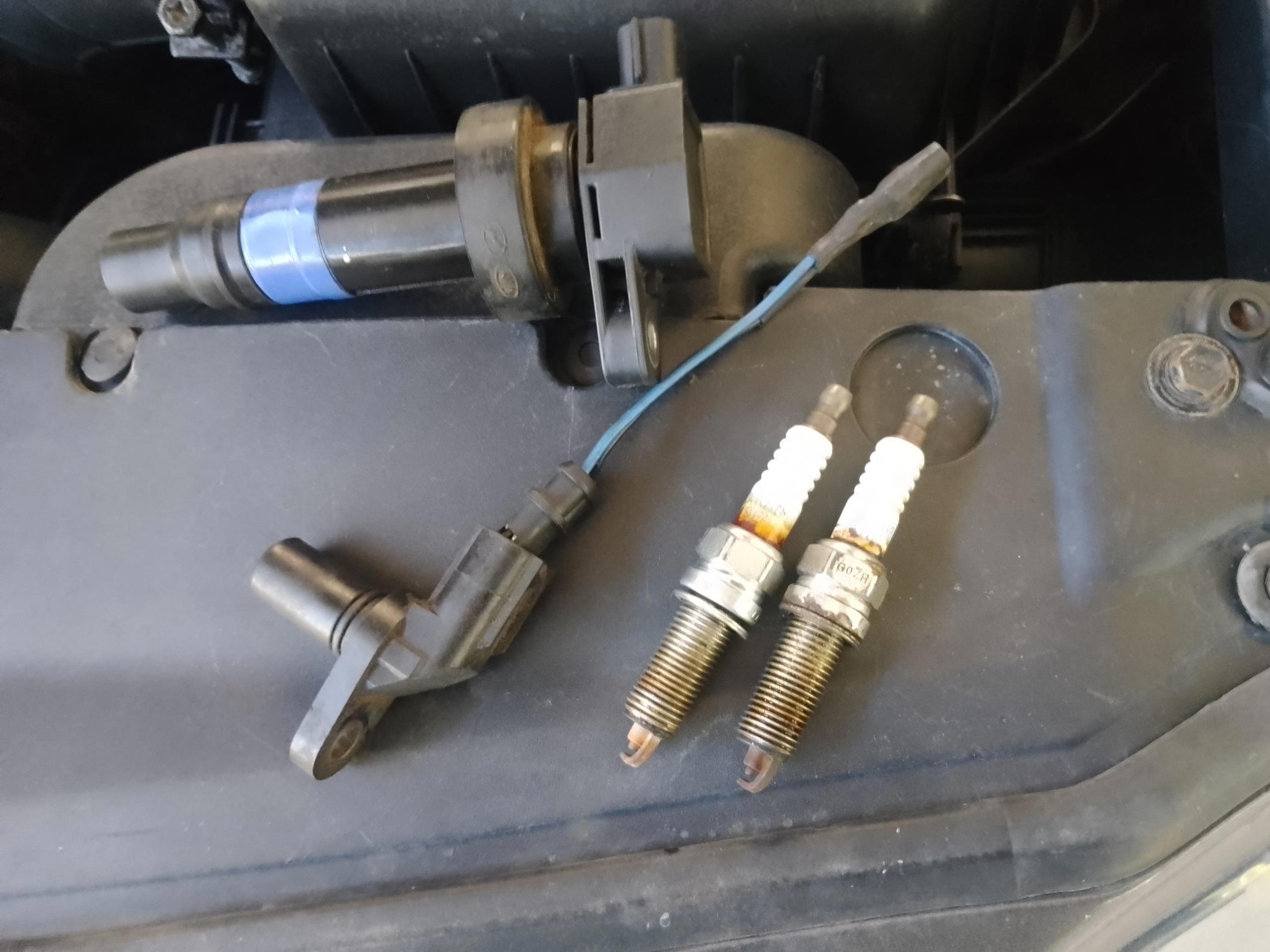 Фото, конечно, не очень, но по нему видно, что на свечах далеко за 10 000 км пробег. Изалента на катушке намотана в месте пробоя, но катуха не ожила. Нашли у себя свечи чуть получше, и отправили его за катушкой. После замены автомобиль начал работать на всех цилиндрах. Фото мотора.
