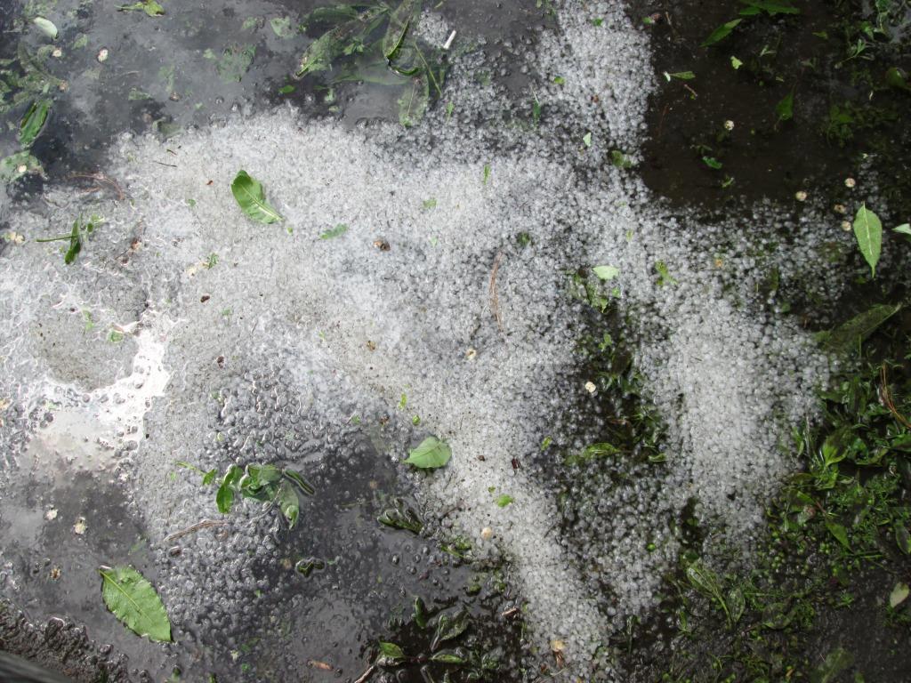 Утром на улице было пасмурно, в окно видны огромные лужи, в которых круги сообщали, что дождь ещё капает. Но следов града я не увидела. Поэтому когда по пути на работу встретила полностью белые лужи, то подумала, что это сбило тополиный пух. Ещё удивилась, как он похож на снег. Но когда подошла поближе, обнаружила, что это действительно снег, точнее, нерастаявший град. Сфотографировать утром не удалось, а град был везде - в лужах, в траве, на клумбах между цветов.