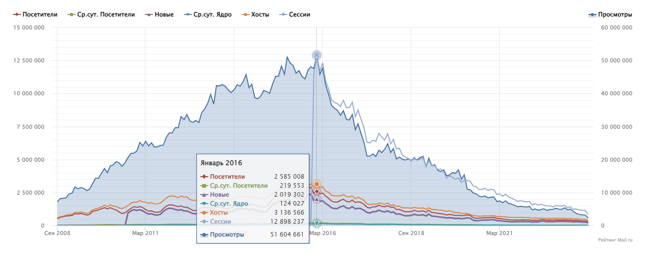 В тоже время Samlib.ru решил навсегда остаться в 2007. Авторы начали разбредаться по более удобным и современным площадкам. В 2016 был покорен последний пик и посещаемость ушла в крутое пике (хотя разные ресурсы рисуют ему 3М просмотров в месяц). Сейчас этот сайт просто некрополь былых времен.