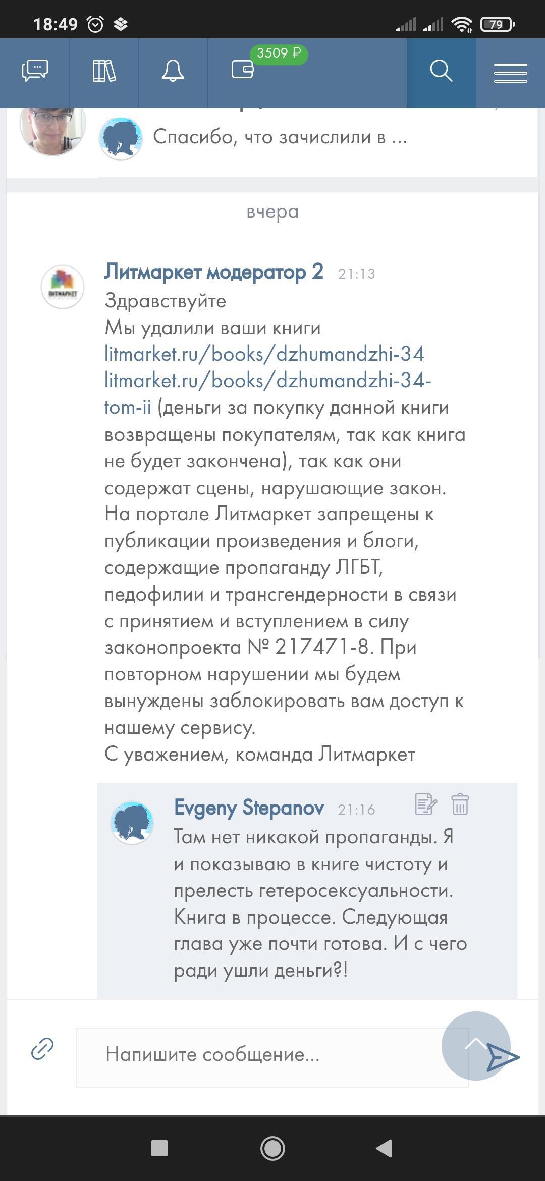 Техподдержка, видимо, работала по МСК времени, потому что ответила быстро. Постановление у них вышло от Госдумы, о запрете пропаганды лгбтни и гомосятины. Поэтому мне они оставили только деньги за первый том, а за второй вернули покупателям.