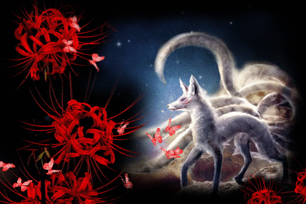 Кицунэ-лиса считалась на Дальнем Востоке демоническим животным, зверем-оборотнем, старые лисы обретали способность принимать вид обольстительных красавиц, завлекали неосторожных молодых людей и губили их, похищая жизненные силы. В Японии белая лисица-кицунэ почиталась в качестве спутницы, вестницы и провожатой духа зерна и бога плодородия Инари, что опять же подтверждает её хтонический характер. Возможно, что зловещая необычная красота цветка Хиганбана пробуждала в сознании образы роковых красавиц. Так, например, в некоторых областях Японии эту лилию называют ойранбана или цветком куртизанок. Куртизанки ойран до середины 18-го века считались в Японии эталоном изящества и рафинированности, поэтому неудивительно, что для соблазнения смертных кицунэ принимали именно этот облик.