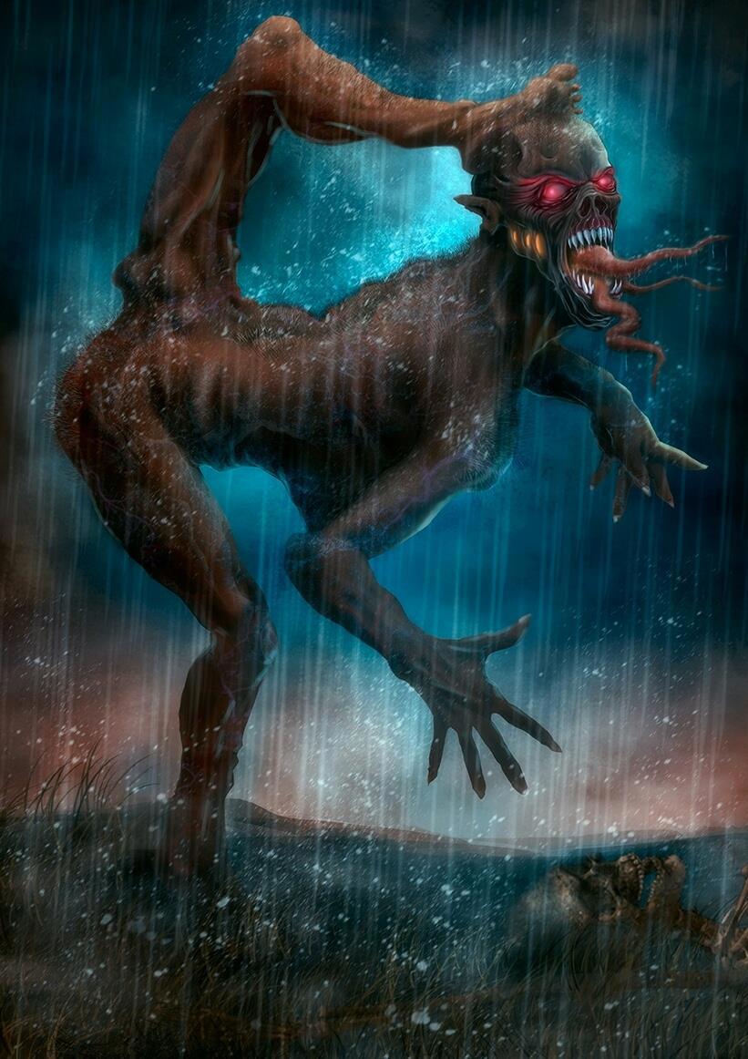 И, словно подпевая этой зловещей песне, с верхушки самой высокой мачт разносился истошный визг. Его издавала мерзкого вида тварь, уродливый гибрид змеи, летучей мыши и рыбы, с кривыми рогами и шипами вдоль хребта. В ответ все громче свистел ветер, надувая паруса призрачного корабля и клубившиеся над морем тучи разражались холодным дождем, под которым, мокрый до нитки и стучавший зубами Этьен сидел в своей утлой лодчонке. Отчаявшись бороться с ветром и волнами, он решил отдаться судьбе и лишь прикрывал рукой рот, зная, что первое, что чувствует экипаж Калеуче — это дыхание.