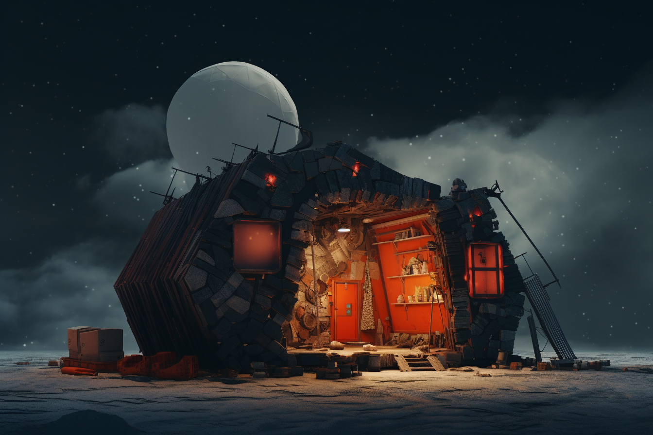 Стащив куски контейнеров к емкости с водой, я соорудил вокруг одной из ламп аварийного освещения нечто, напоминающее логово слетевшего с катушек робота-погрузчика. Сверху положил внахлест листы термоизоляции. Обрезками проводов притянул конструкцию к стенке, чтобы не разлеталась.