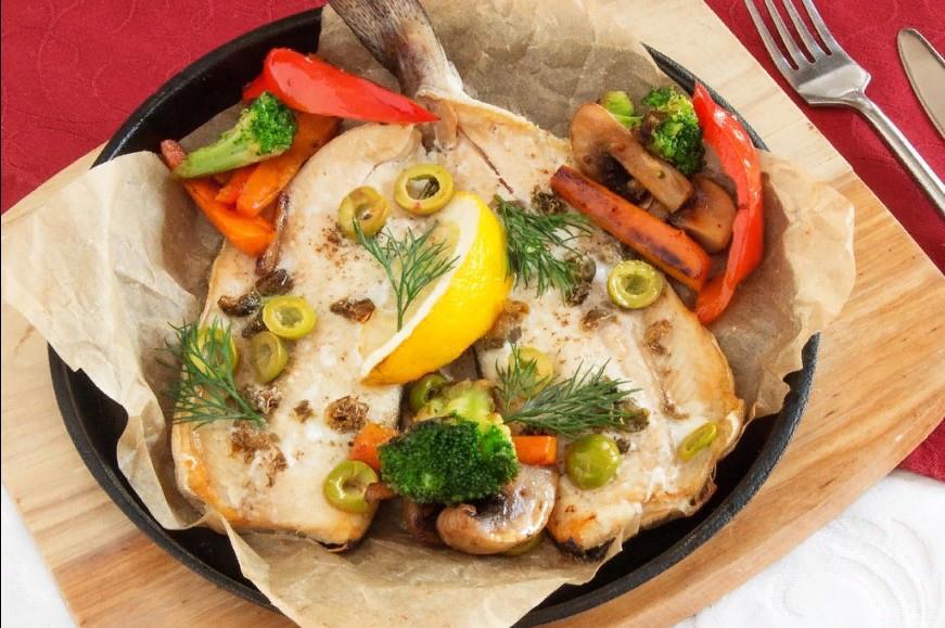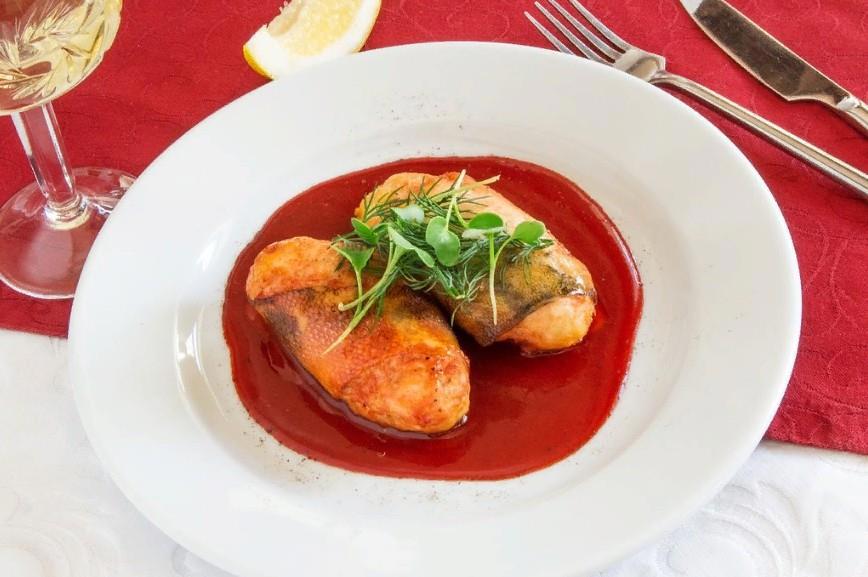 «Рыбная рапсодия» — ассорти из слабосоленой семги, царской рыбы, отварных кальмаров, мидий и красной икры; Шашлычок из морских гребешков и креветок. «Уха "Парламентская"» — рыбный суп из судака и сибаса. «Судачок по-боярски» — филе судака с грибами, помидорами, запеченное под сыром с майонезом. "Форель речная" аж со сладким перцем и лимоном (утром ещё, небось, вовсю плавала?!). Местечковые королевские мидии (фиг откроешь без подручной монтировки!). "Влюбленные креветки" (ага, стопудово, родом и самоходом прямиком из Клязьмы). «Струдель горячий» — рулет из слоеного теста с персиками и корицей подается с ванильным соусом и шариком мороженого. «Мороженое Романов» — два шарика мороженого с клубничным соусом и взбитыми сливками; Жюльен из мидий и креветок…