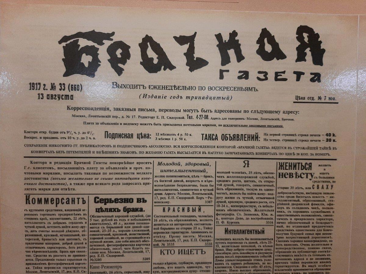 Среди рекламных вывесок и воссозданных интерьеров меня, не скрою, больше всего заинтриговал — выпуск «Брачной газеты», «с помощью которой жители дореволюционного Владимира пытались устроить свою личную жизнь». Чтение опубликованных там объявлений заставило меня, благо Исы поблизости не было, не только пару раз улыбнуться, но и даже, с минуту-другую — откровенно и беззаботно поржать.