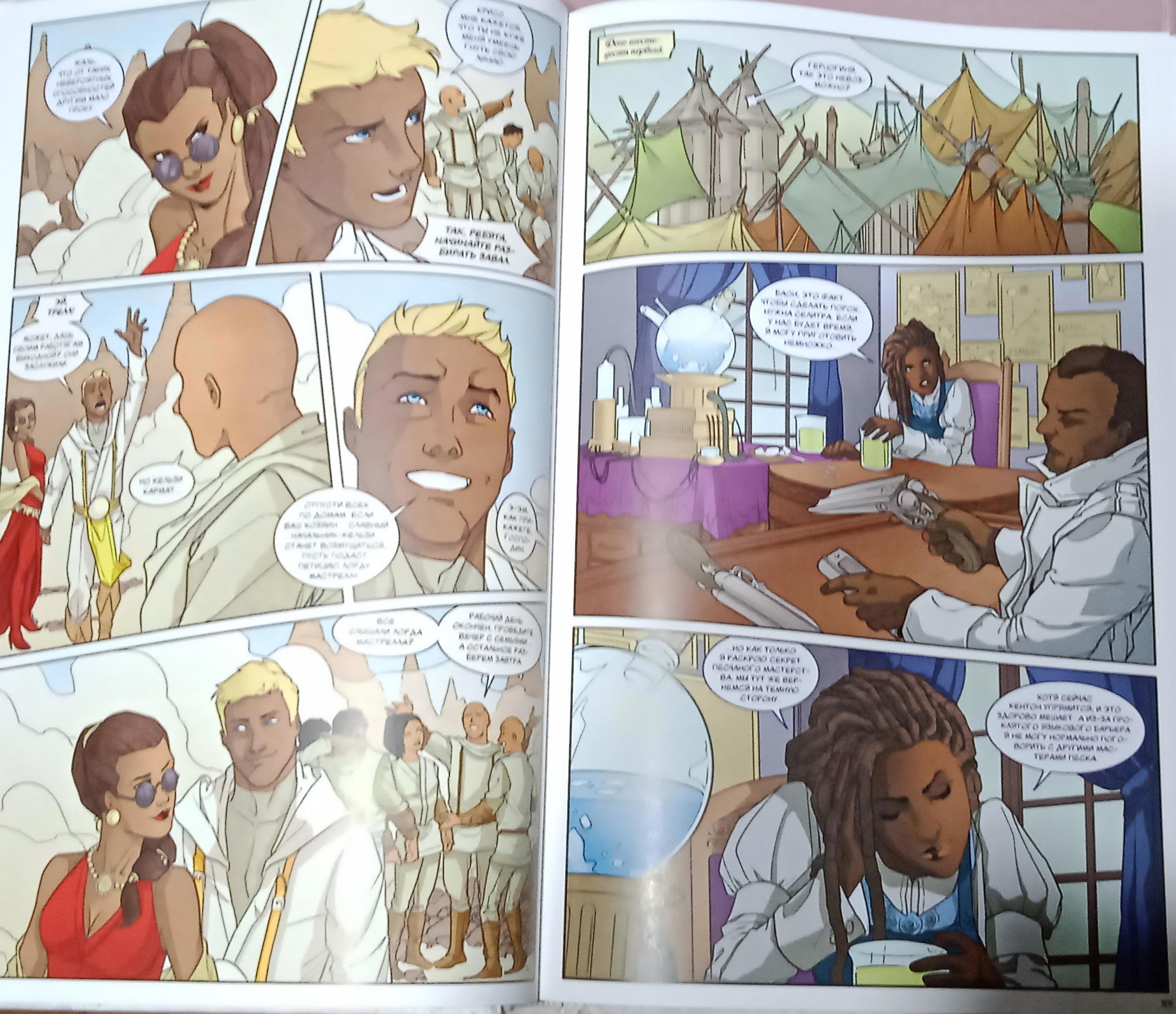 Автор: Руслан БирюшевДобыл тут интересную штуку - первые два тома комикса "Белый песок", основанного на сюжете Брендона Сандерсона. Сюжет довольно ранний, но обработанный автором не так давно, перед передачей комиксистам, потому такого наивняка как в "Элантрисе" там, к счастью, нет, зато есть очередной интересный мир с необычной системой магии. Только детализация теперь ещё и в визуале проявляется. В общем, вдаваться в детали не буду, про товарища Сухова в других рецензиях уже пошутили...