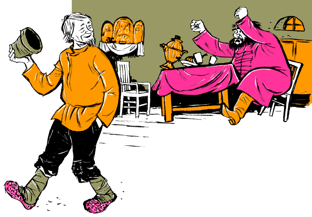 — Дайте-ка нам с мужичком выпить да закусить и принесите обед, да побыстрее! Садись, садись, не робей, ешь, пей, сколько твоей душе угодно!