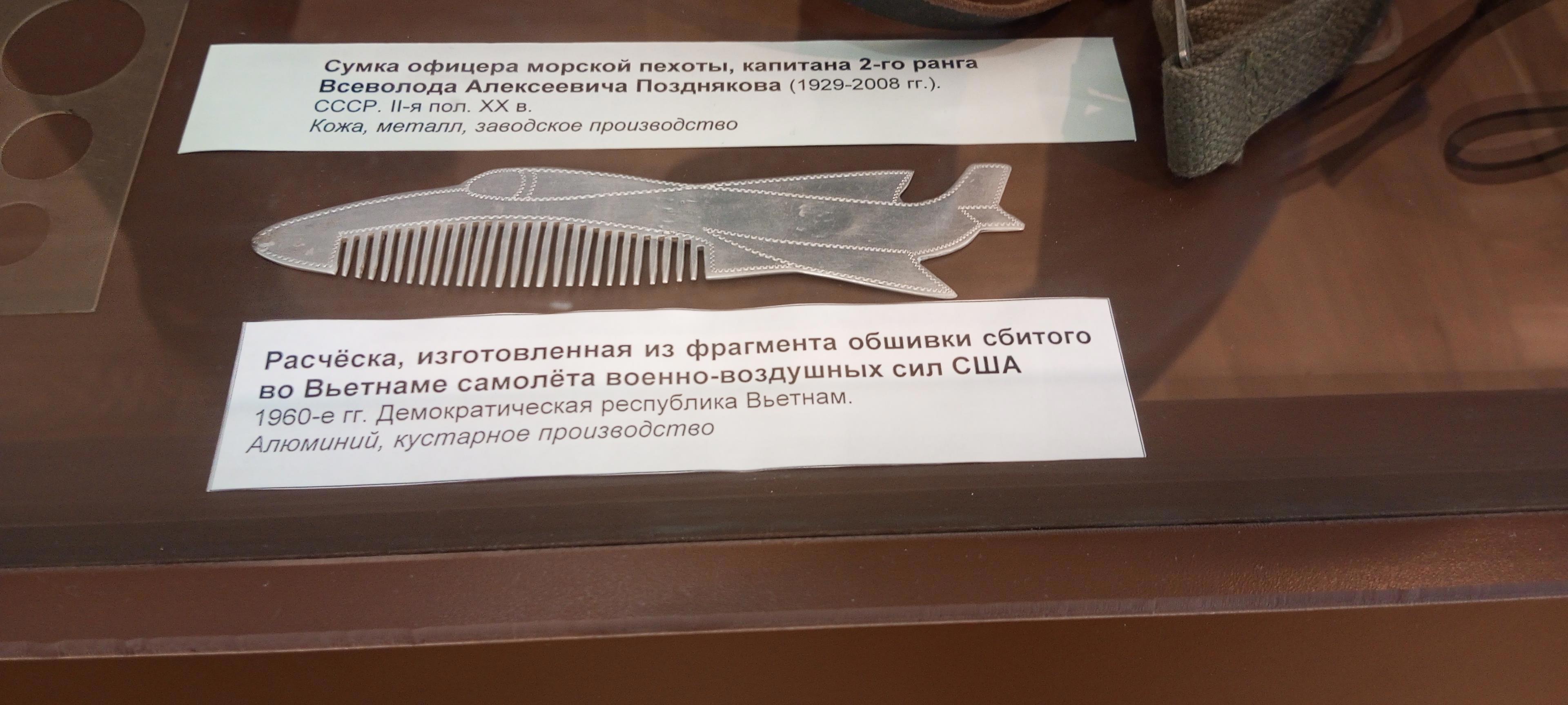 Еще одна особенность смоленского музея: несколько залов посвящено смолянам, которые так или иначе принимали участие в заморских походах, особенно в современный период: Афганистан, Африка, Вьетнам. Речь, конечно, идет о различных вариантах интернациональной дружбы в СССР. Мне почему-то особенно бросилась в глаза расческа, сделанная из обшивки американского самолета, сбитого где-то во Вьетнаме нашими военспецами, естественно из Смоленска.
