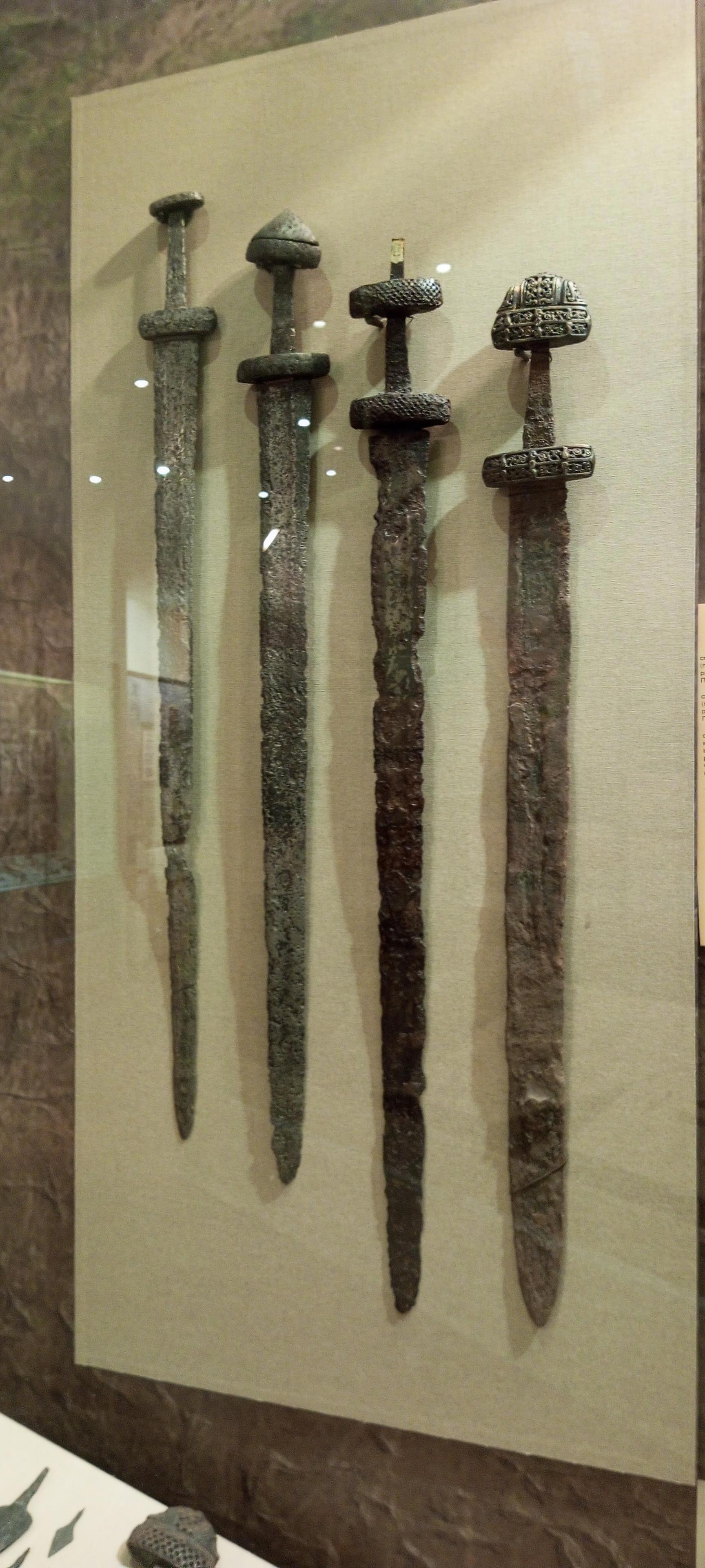 Отдельно можно сказать о том, что в коллекции смоленского музея есть аж четыре настоящих меча, и именно не копий, а ржавых, вытащенных из земли. Со всеми необходимым атрибутами в виде лезвий и рукоятей. Такие мечи часто называют "варяжскими", потом стали называть "русскими". И вообще-то найти такие мечи в нормальном состоянии при археологических раскопках большая редкость. А вот в Смоленске они есть, и немало видать на своем веку они голов порубали из-за злата, да серебра.