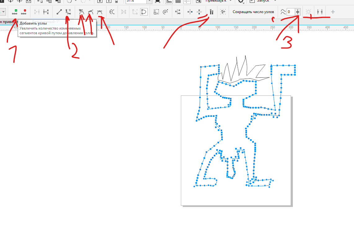 - Добавить узлы. Это, чтоб впоследствии фигура не особо потеряла форму, просто острые концы скруглить... чем меньше узлов изначально, тем сильнее искажение. В зависимости от того, как кругло нам надо, решаем это.