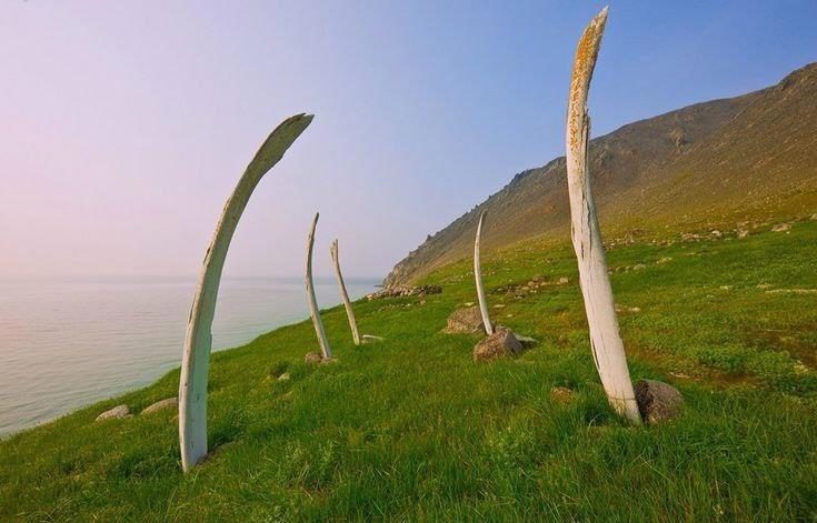 Путешественники, подплывающие к этому загадочному месту уже издалека видят ошеломляющую картину — из земли возвышаются гигантские останки гренландских китов — их черепа и изогнутые кости.