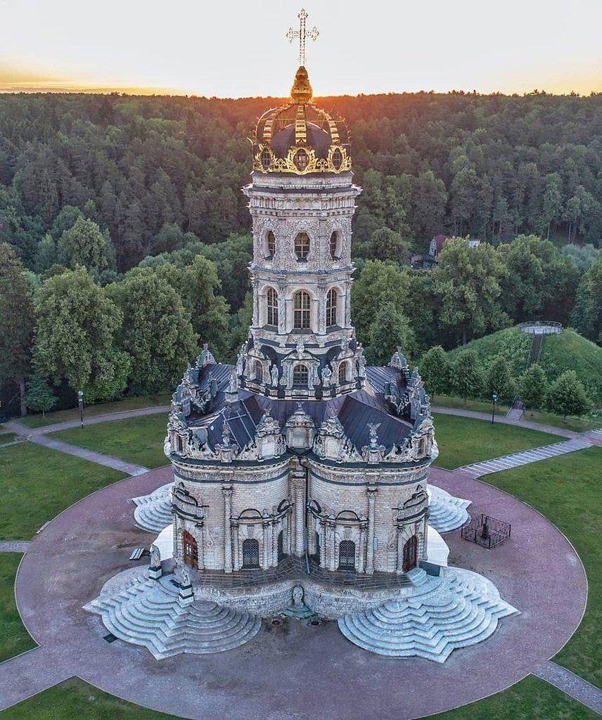 Дубровицкая церковь в России выделяется своей уникальной архитектурой: вместо обычного купола или шпиля, она украшена золотой короной и богатыми скульптурами из белого камня.