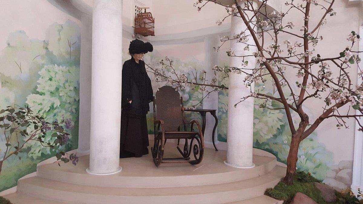 Из каждого отдельного фрагмента складывается целостный образ: белые колонны барского дома, садовая аллея, ажурная ограда. Здесь же: кусочек цветущего яблоневого сада с канарейкой в клетке и креслом-качалкой. Одна из самых выразительных деталей — манекен престарелой барыни, сидящей у камина под символичной картиной «Всё в прошлом».