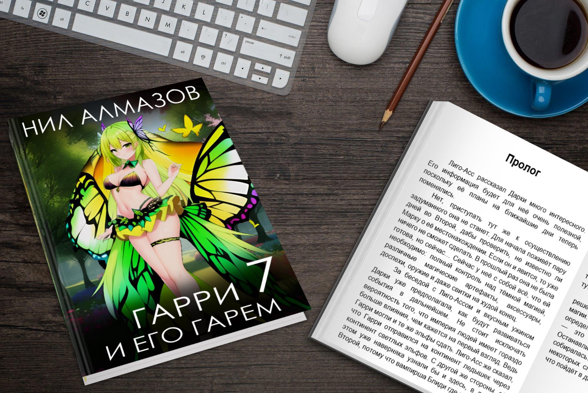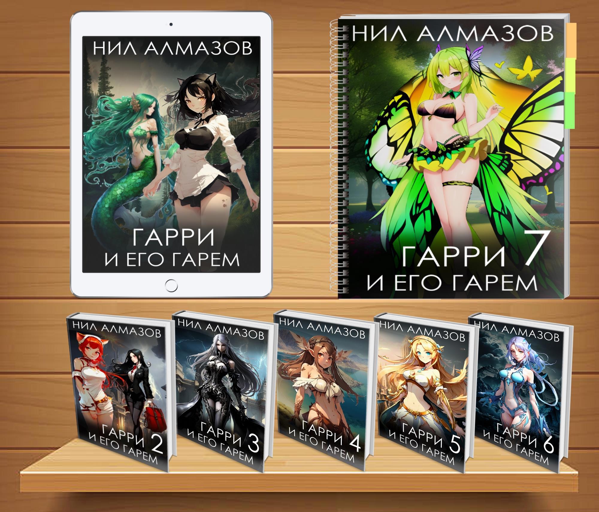 Представляю вашему вниманию цикл «Гарри и его гарем». Да, цикл ещё в процессе, но уже написано шесть небольших томов целиком. Седьмой том стартовал буквально несколько дней назад, именно поэтому на следующей картинке он изображён как блокнот с закладками.