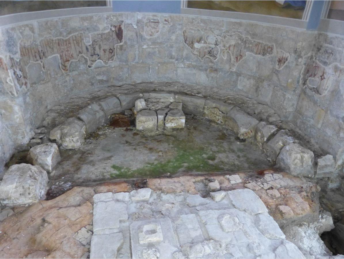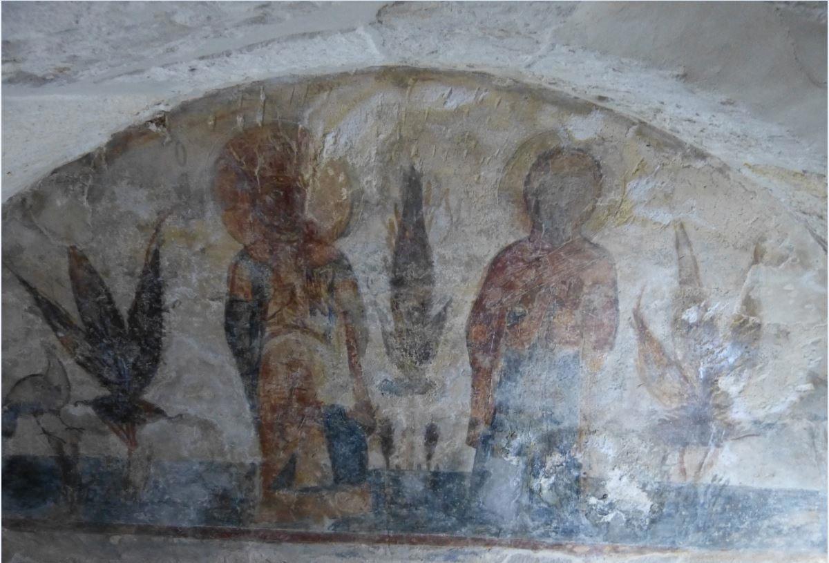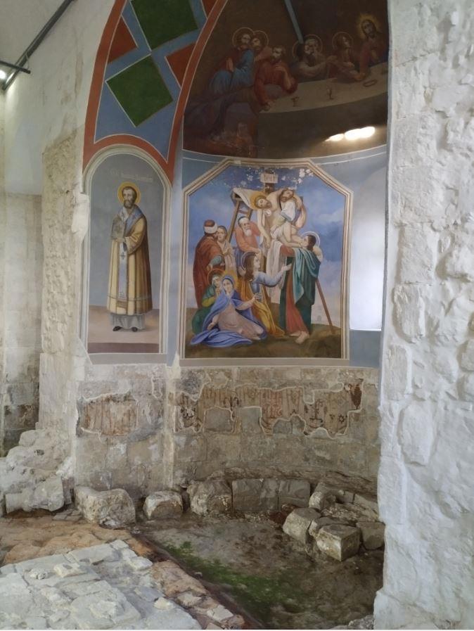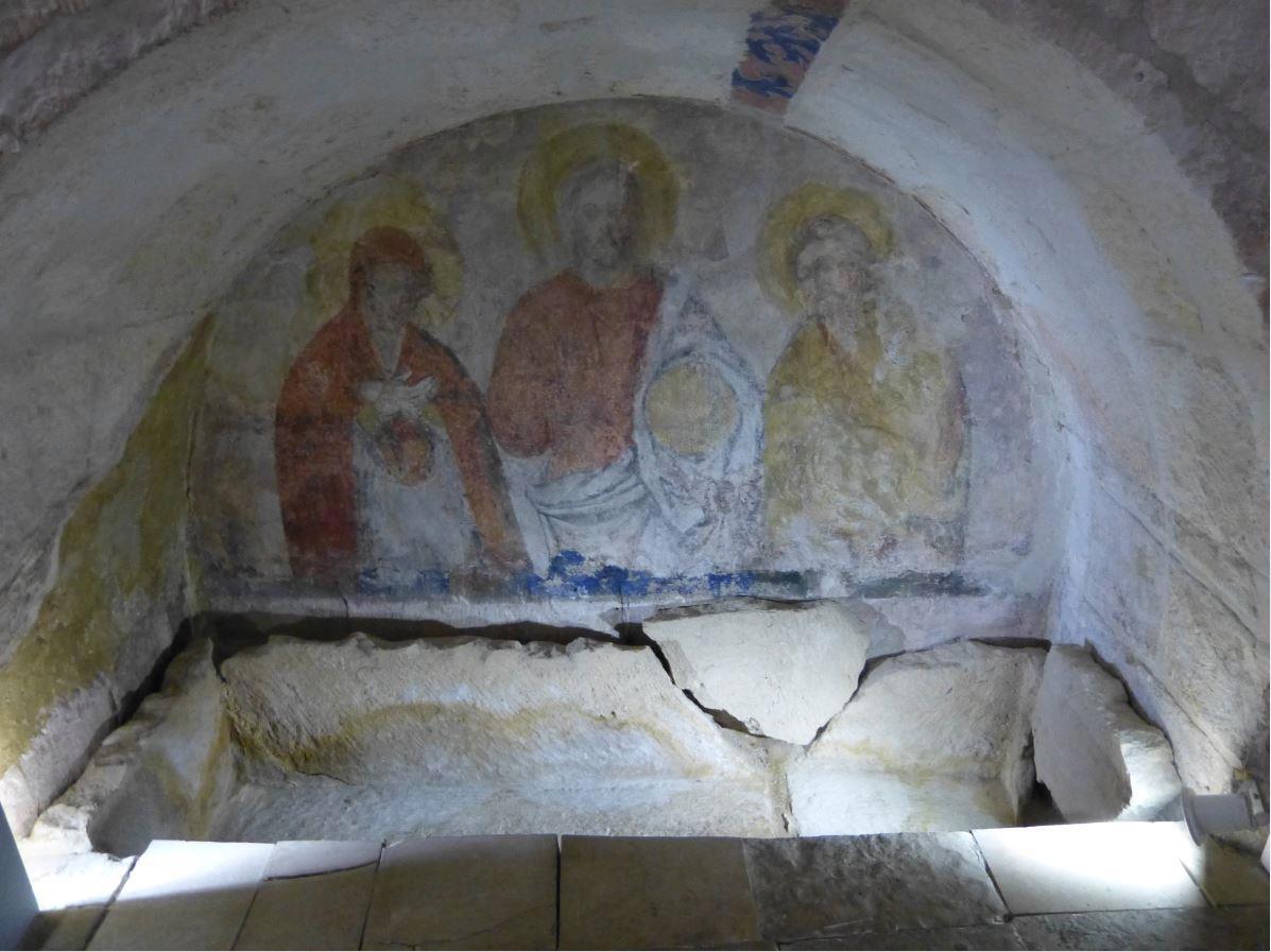 И совсем крошечные фрагменты фресок XII века были найдены после раскопок в нижней части центральной апсиды.