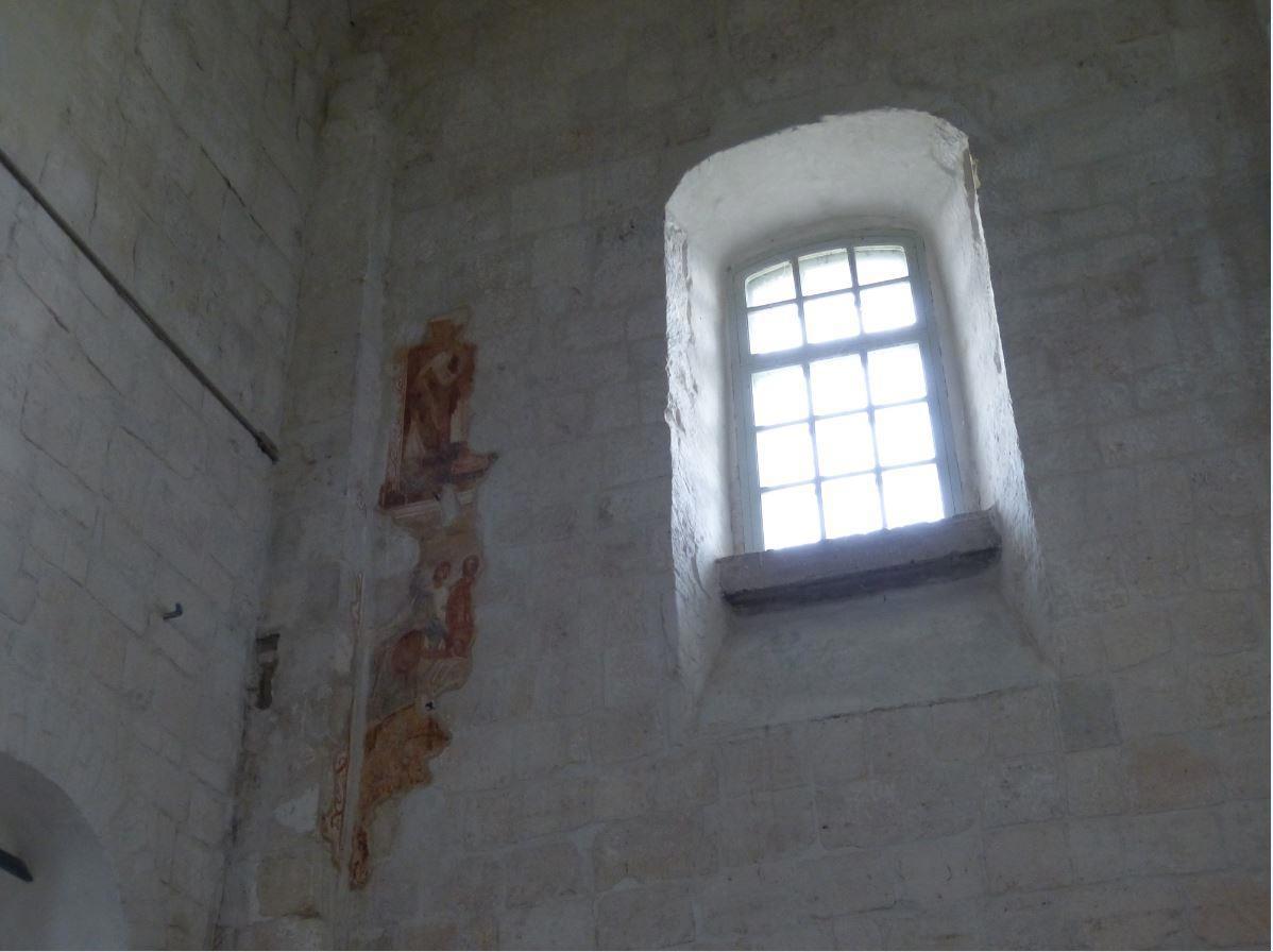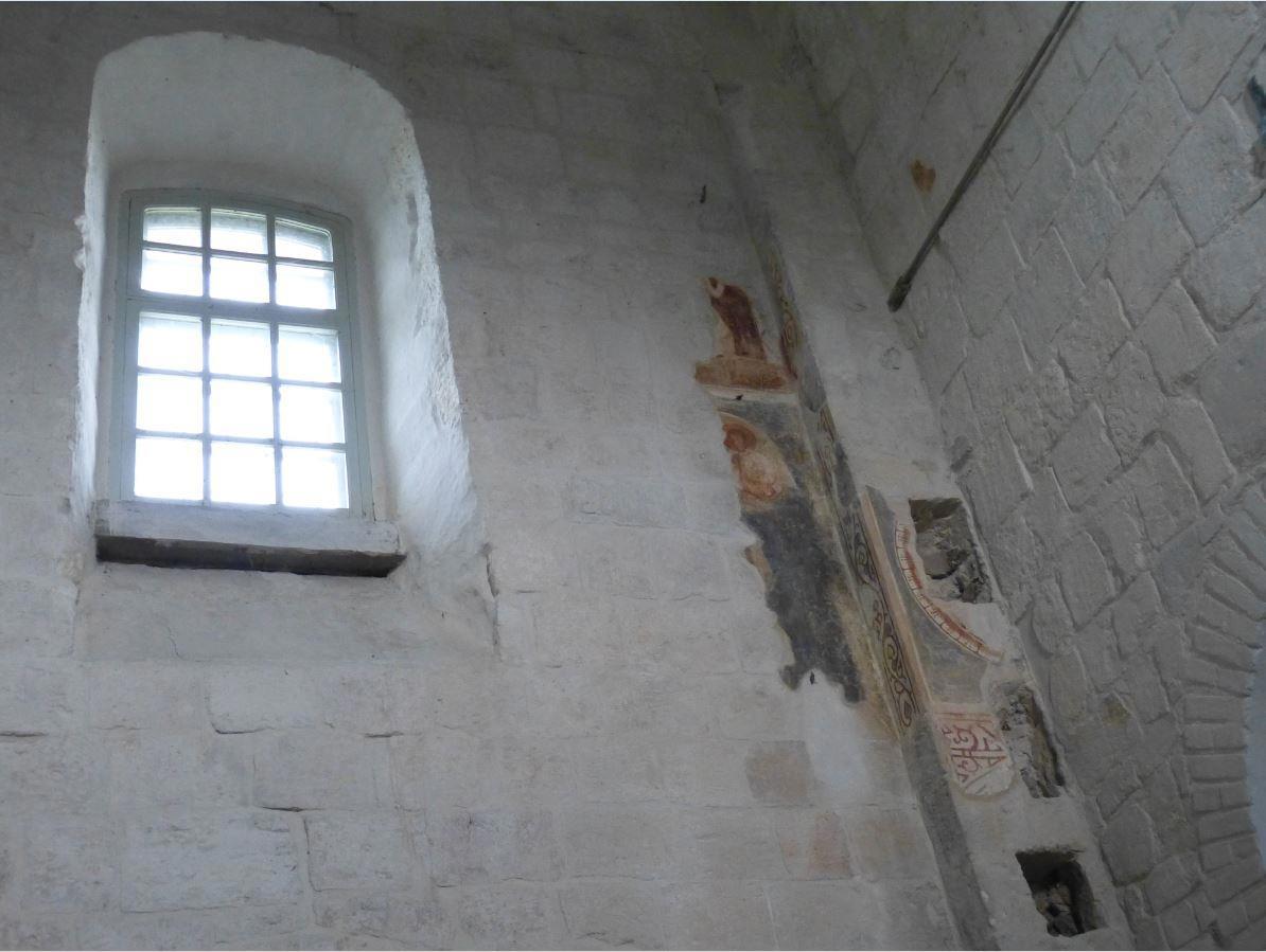 Маленькие фрагменты фресок XII века сохранились на стенах церкви.