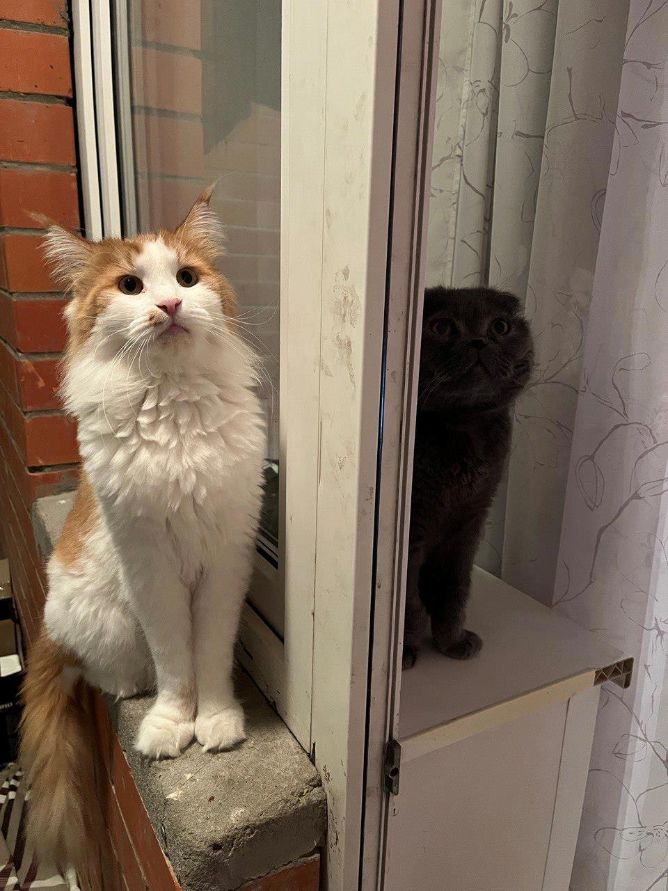 Изначально миски стояли в разных концах квартиры в соответствии с зоной обитания каждого кота: Кнопины - на кухне, Ремарка - в гардеробной. Но этот концепт потерял смысл, когда коты стали есть из кормушки соседа. Более того, постепенно Ремарк перебрался из гардеробной в сторону кухни - здесь у него любимая лежанка в уголке, подоконник для обеденного сна, и выход на балкон, к огромной подушке.
