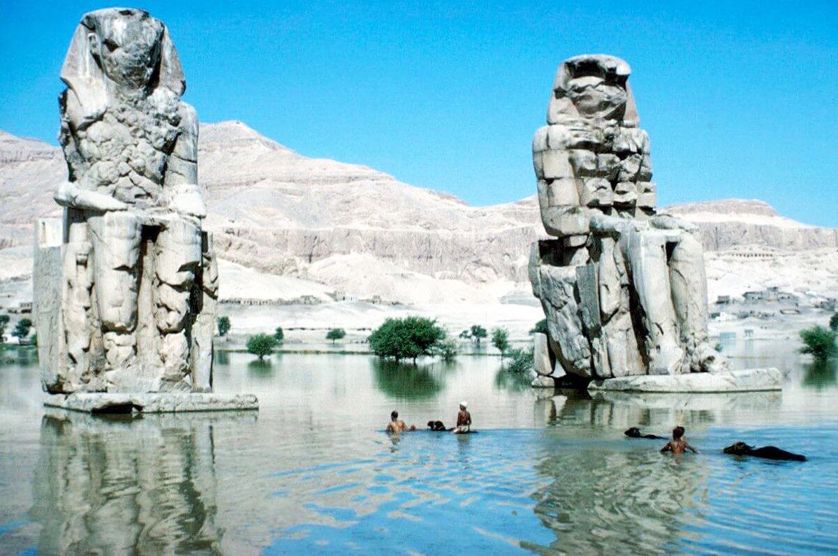 "Колоссы Мемнона" Статуи Аменхотепа III охраняющие уже несуществующие ворота , ведущие на территорию исчезнувшего храма. Разлив Нила. Храм был построен таким образом, чтобы в период разлива огромная ладья со священной статуей торжественно выплывала из здания.