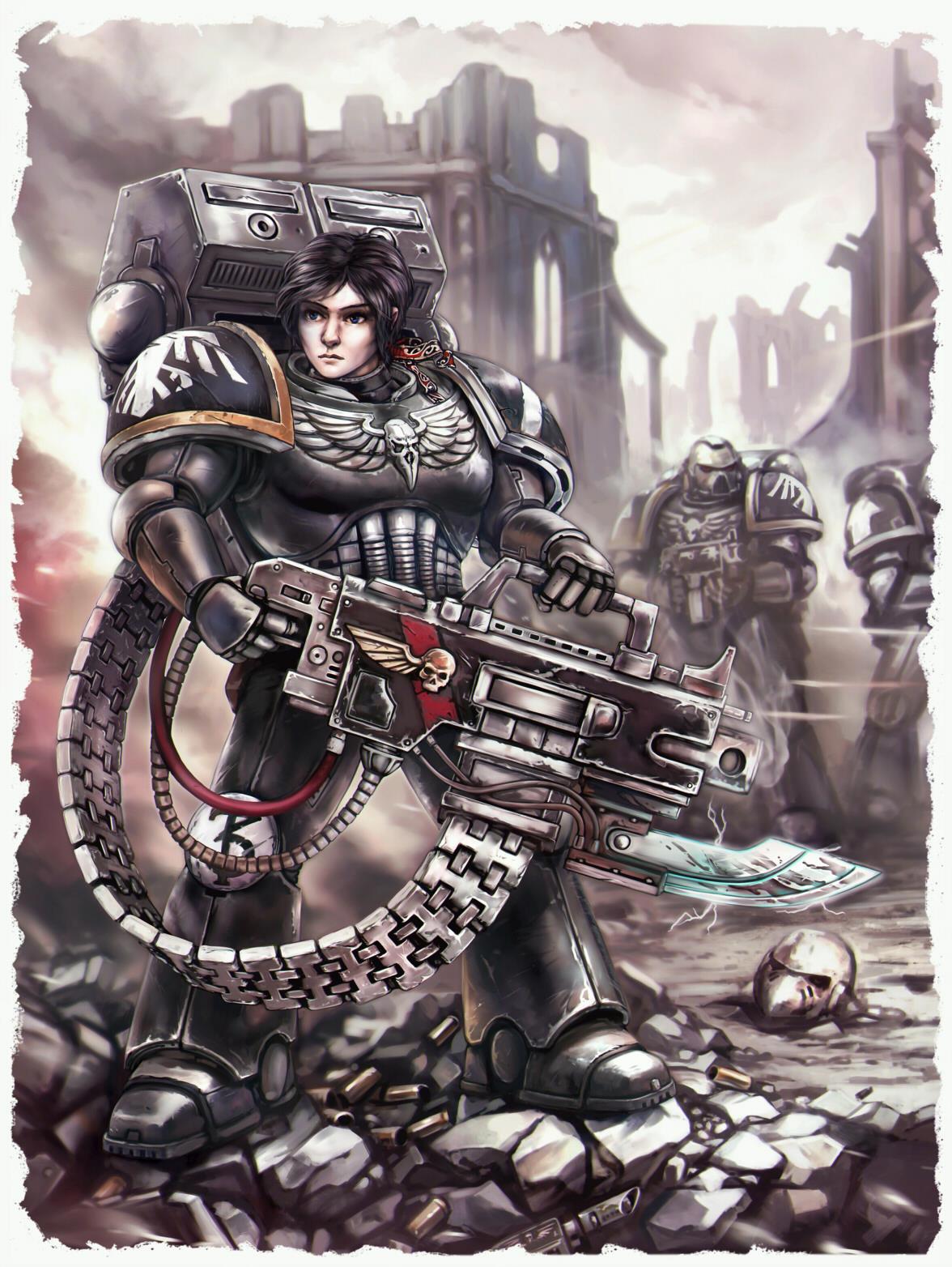 Некоторое время назад в своём блоге я проводил необычный опрос - кто-то ещё может его помнить. А именно: "К какому ордену космодесанта из вселенной "Warhammer" вы бы отнесли большую любительницу превозмогать и просто суровую до невозможности девушку, сержанта Третью из "Безымянных солдат"?". Тогда опрос энтузиазма не вызвал, и я уже было решил отказаться от идеи небольшой шуточки. А именно - я хотел заказать простенький скетч, изображающий Илку Джефферсон в облике космодесантника. Но - читатели этим особо не заинтересовались, художник, к которому я обратился загодя, оказался занят на полгода вперёд... В общем, затее грозило забвение. И тут на сцену выходит товарищ tr0yka и спасает ситуацию! И вместо простенького карандашного скетча мы получаем...