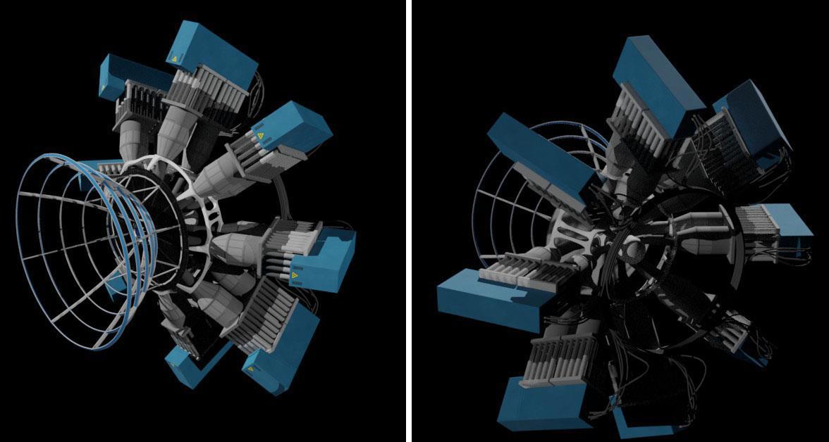 Этот же самый пинч-эффект используется для генерации электроэнергии - плазма поступает в реактор и там тепло конвертируется в электричество. Для красоты я сделал так, что ядро светится загадочным голубоватым светом (вообще по идее должен бы красным, в тон радиаторам, но это не вязалось с общим тоном картинки). Добавив баки с дейтерием и литием, я получил такое: