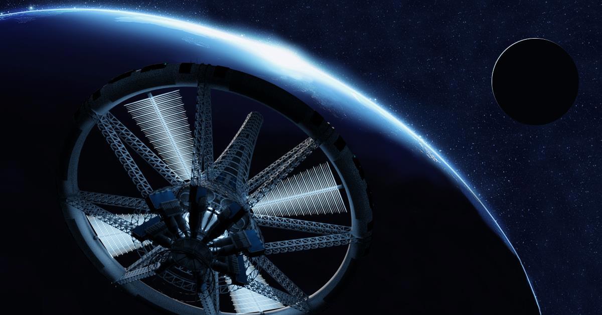 Далее остаются несущие конструкции и жилой тор. Забавно, но когда я искал в интернете изображения аналогичных станций, ни на одном (sic!) из них не было центробежных двигателей, которые по идее должны замедлять и разгонять вращение бублика когда надо. А они нужны - маневрировать в космосе вращающимся бубликом гораздо труднее, чем обычным кораблём, так что замедлять и разгонять его придётся.