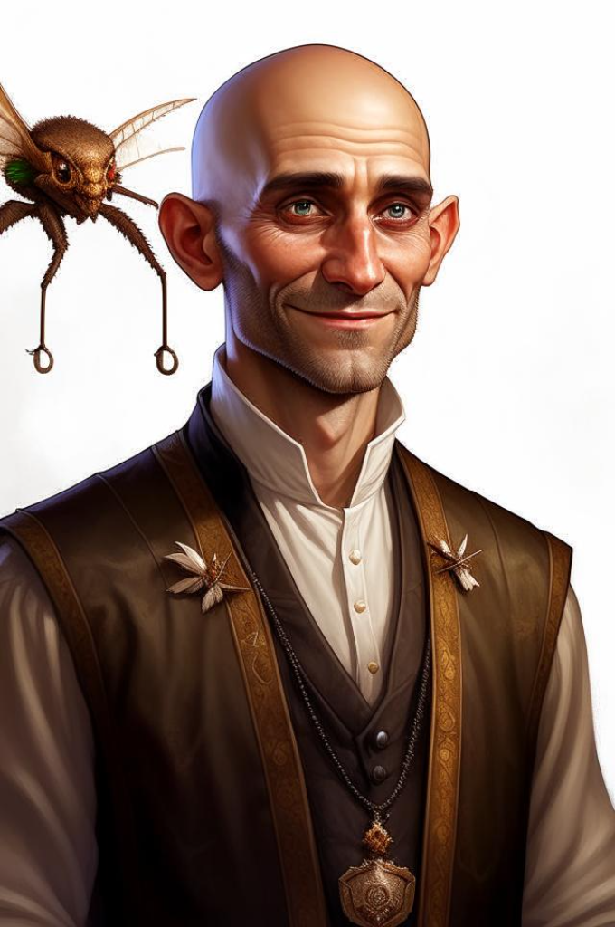 Но мне-то нужно было изобразить мужчину средних лет с задорной улыбкой, лысого и со стрекозиными крыльями за спиной! А, ну ещё и в отличном элегантном костюме с жилеткой — с этим справился на отлично)) С лысым и задорной улыбкой тоже. Небритость лишняя, он ведь совсем лысый. Но где стрекозиные огромные крылья? Где?! И что это за страх и ужас за ним болтается?