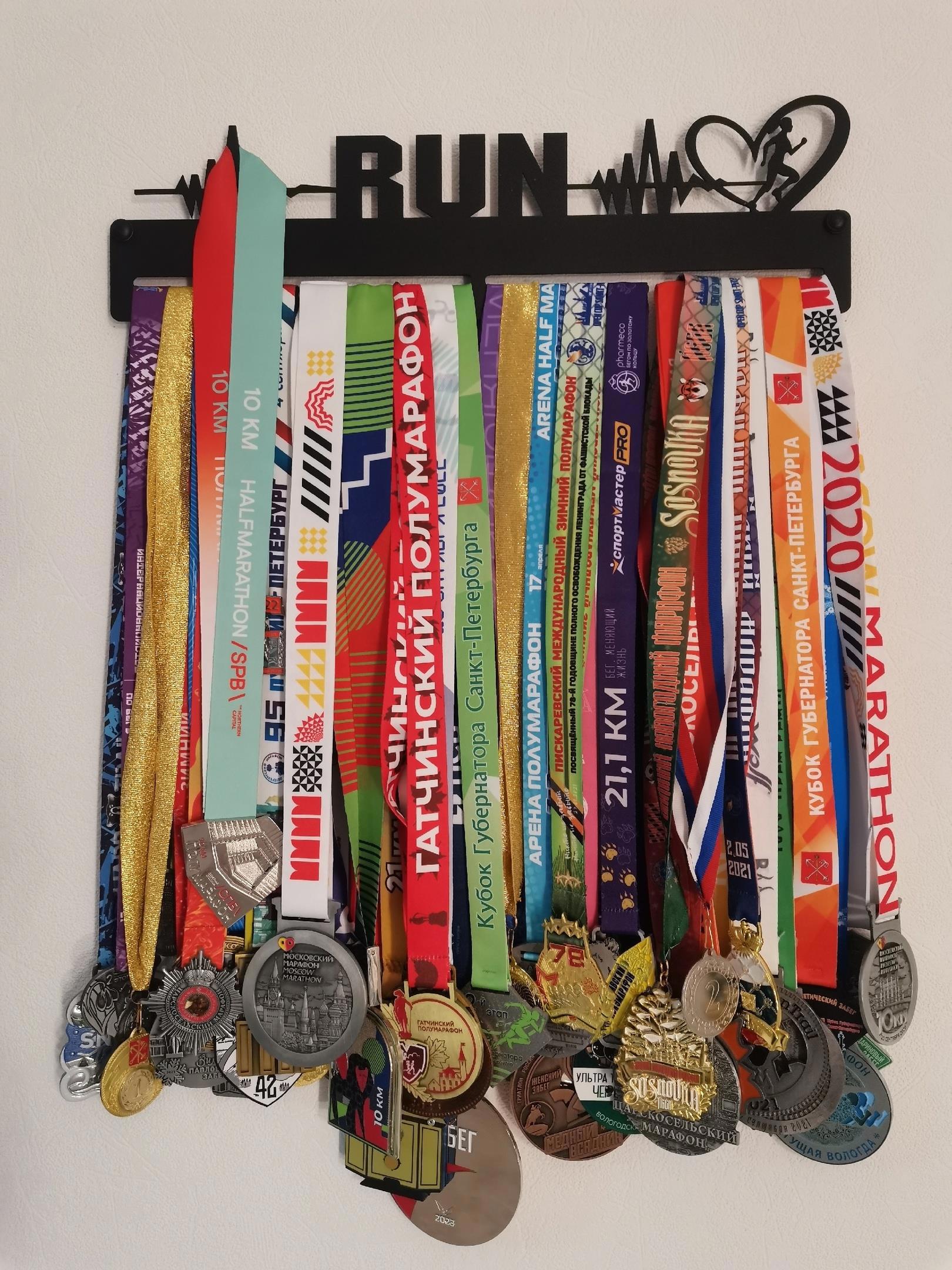 А это моя прелесть. Здесь все мои медали участника + немного медалей за места в возрастных группах за все 4 года, что бегаю.