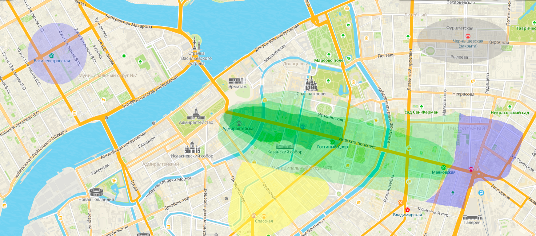 В этой же категории выделила бы улицы в районе м. “Чернышевская”, но станция сейчас закрыта, поэтому на карте отметила как серую область. Конечно, там есть наземный транспорт, поэтому при желании можно рассмотреть и эту часть города.