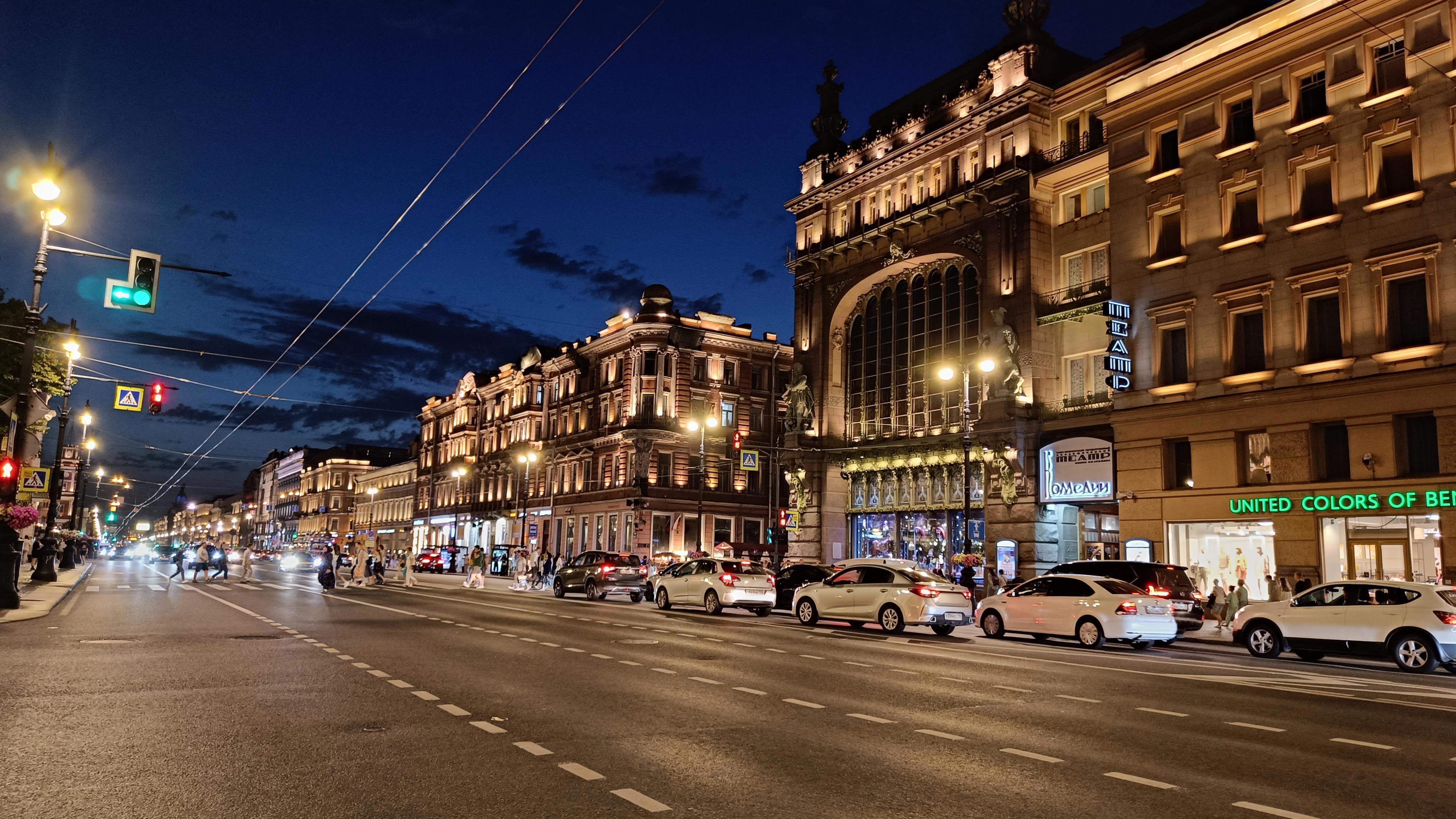 1. Зеленым вдоль Невского проспекта от его начала до Гостиного двора: идеально.