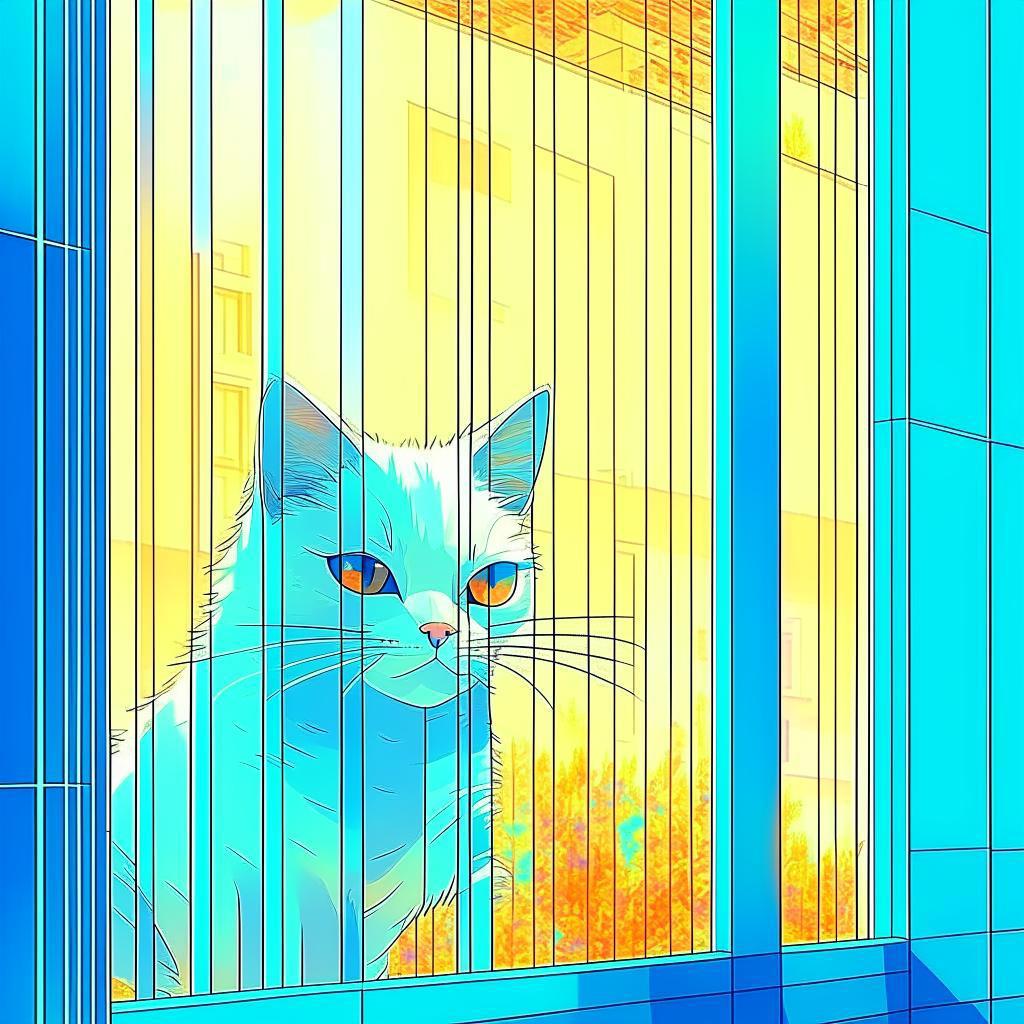 Кошка еще плотнее, с оранжевыми глазами и животом. Детализации прибавилось. Цвет - желто-оранжевый с небольшими включениями ярко-голубого, солнечная засветка.