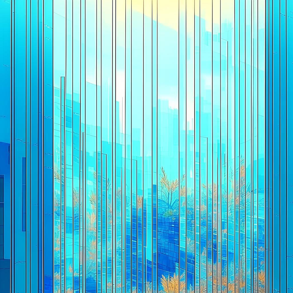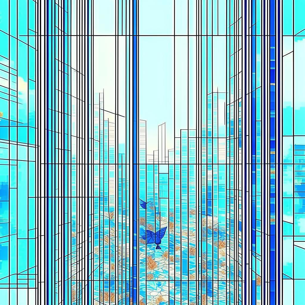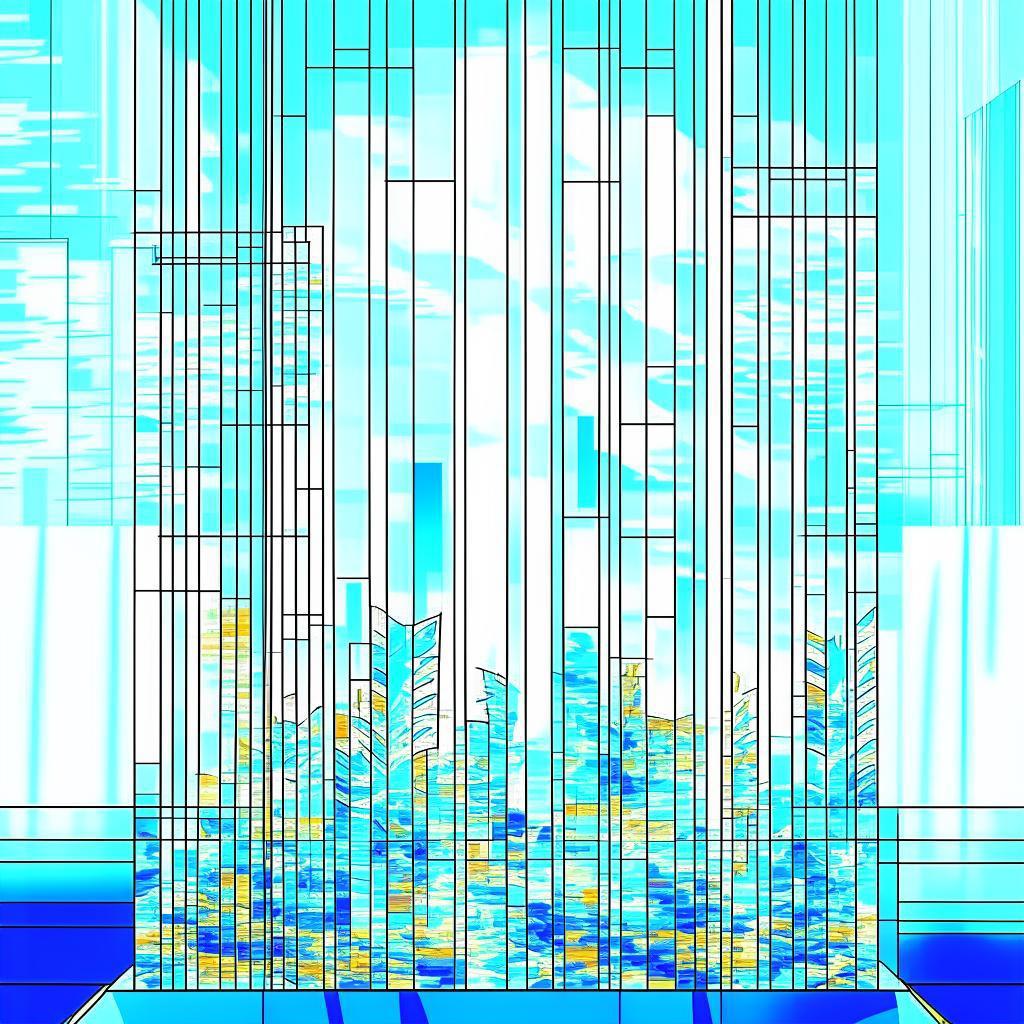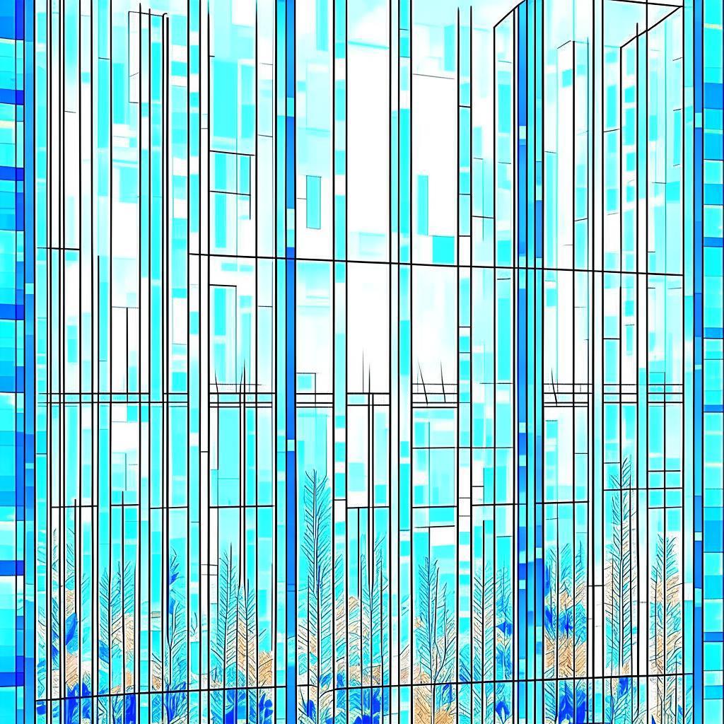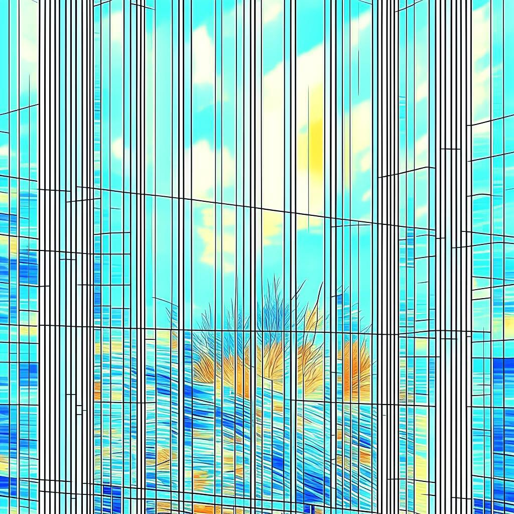 Витраж с условным рисунком. Небо. Металлические направляющие, свободные линии. Цвет - от светло-голубого до темно-синего. Детализация падает.