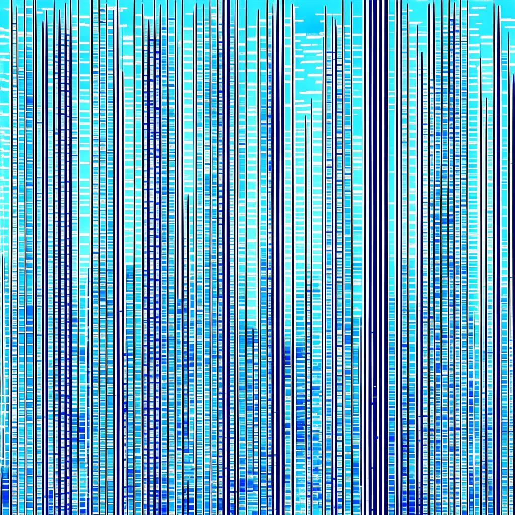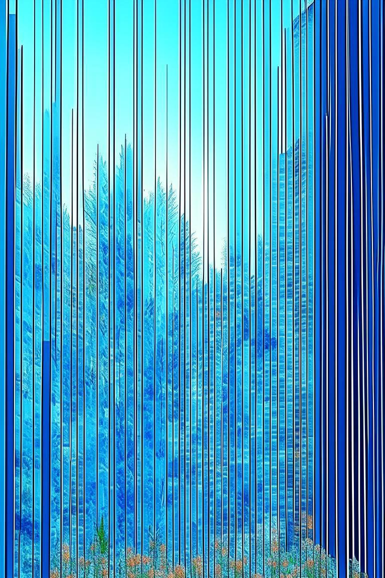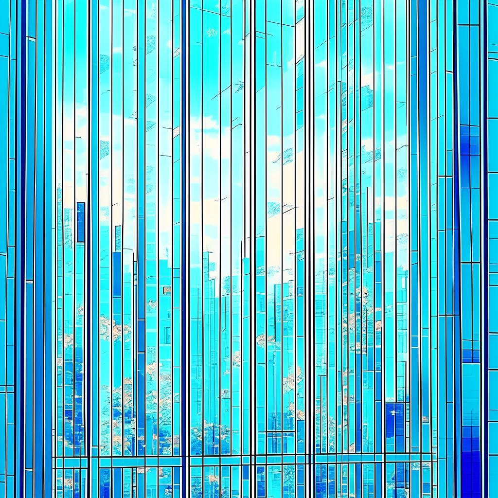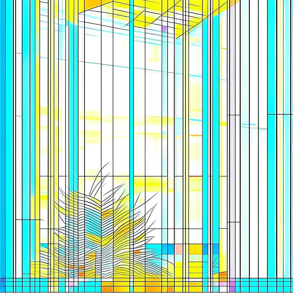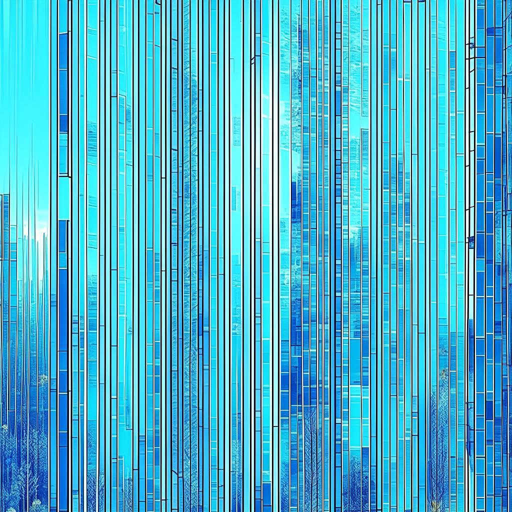 Витраж с условным рисунком. Небо. Металлические направляющие, свободные линии. Цвет - от светло-голубого до темно-синего. Детализация падает.