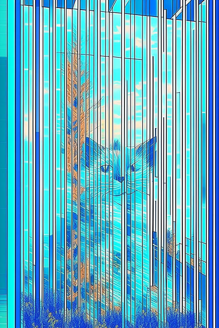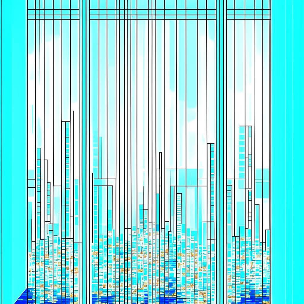 Витраж с очень условным рисунком, в основном однотонный. Небо. Металлические направляющие, свободные линии. Цвет - от ярко-голубого до ярко-синего. Детализация снова падает.