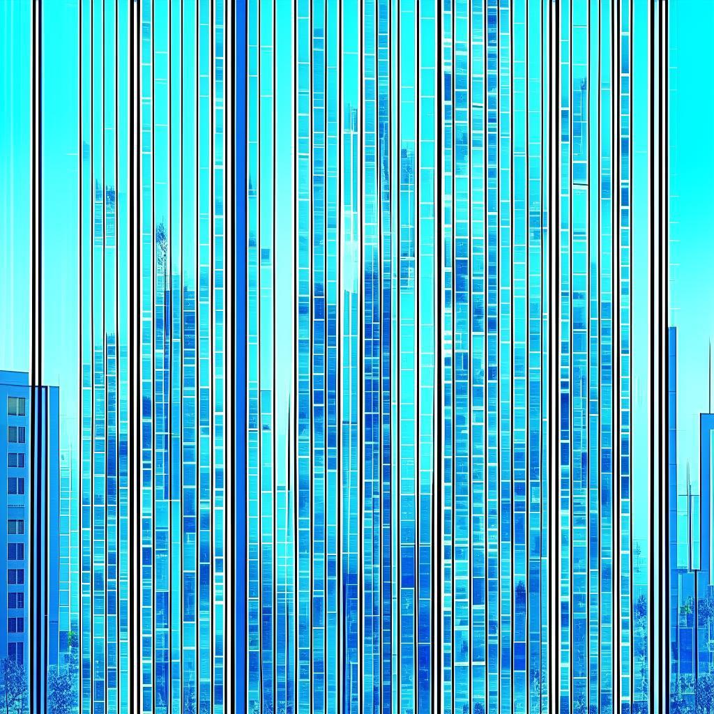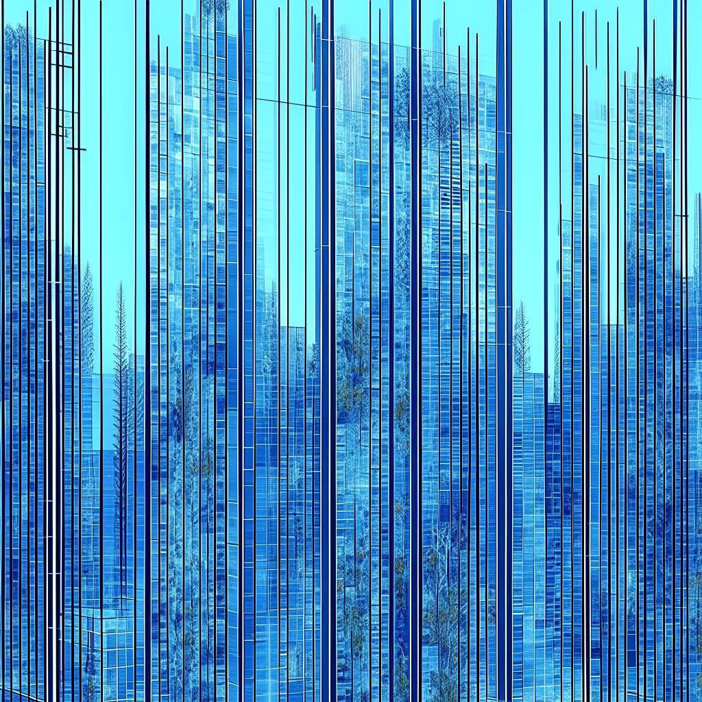 Текущее изображение: городской пейзаж с высотной застройкой и небольшой степенью детализации, характерный для современности или условного ближайшего будущего. Явно выражены два плана по глубине и вертикальные членения объемов. На рисунке опознаются солнце (луна), металл, стекло, лабрадорит, в нижней части — условная растительность.
