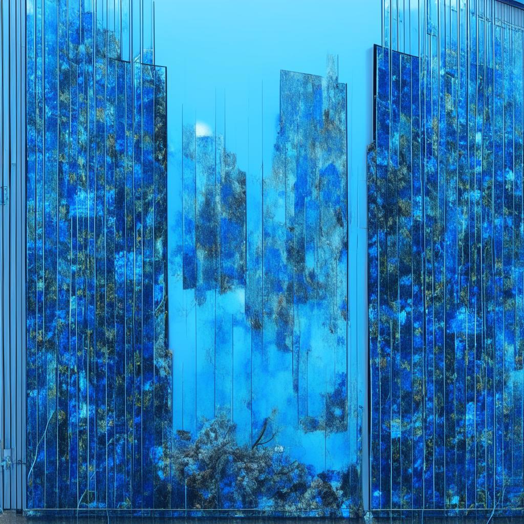 Витраж без рисунка, почти однотонный. Металлические направляющие, свободные линии. Цвет - ярко-голубой, ярко-синий. Детализация почти нет, изображение практически выродилось.