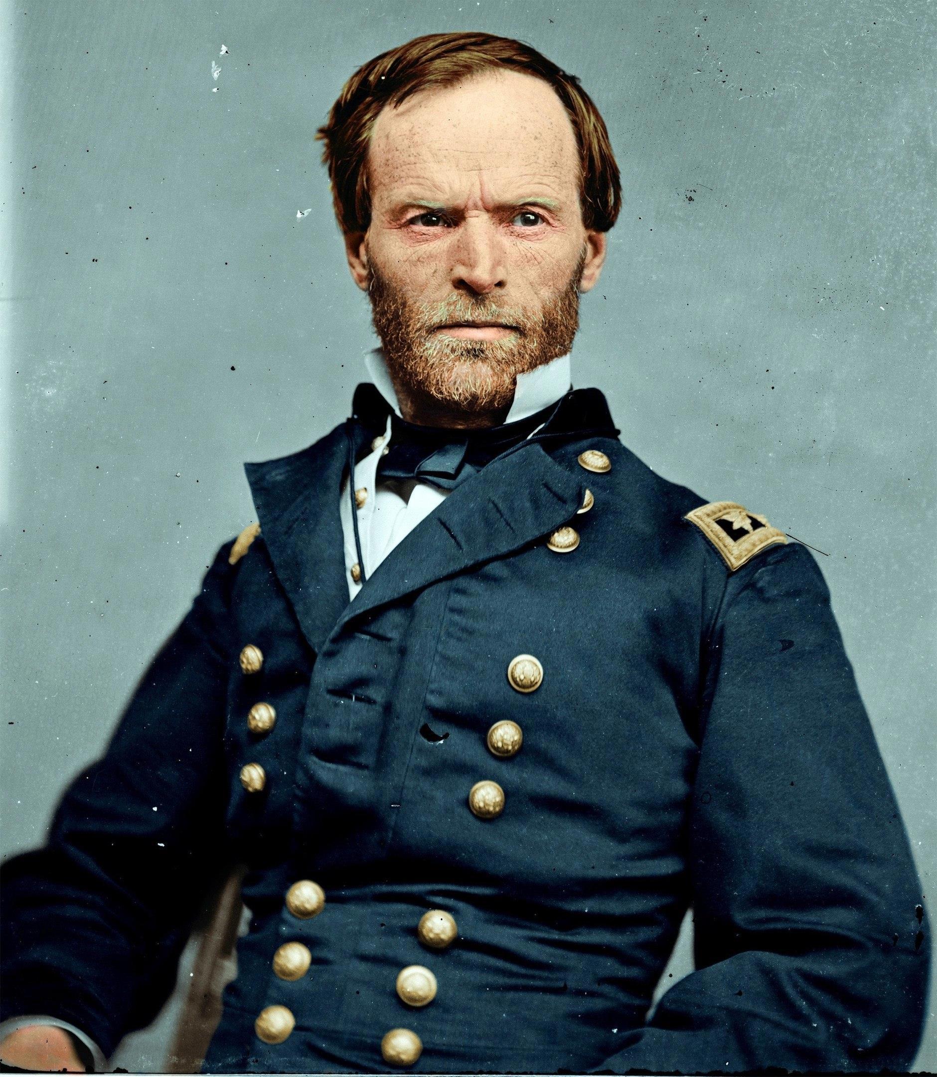 Начнем, по традиции, с северян, как с победителей. Открывает нашу серию некто Уильям Текумсе Шерман, отец "тотальной войны". Сначала служил в Западной армии северян под командованием генерала Улисса Гранта. Потом самостоятельно командовал ею. В военную историю Шерман вошел своим «Маршем к морю», рейдом от Атланты до Саванны в 1864 году, разрезавшим территорию Конфедерации пополам и уничтожившим остатки экономики мятежных штатов. В ходе рейда солдаты Шермана разрушали железные дороги, сжигали склады с запасами товаров, в первую очередь – хлопка, а также грабили местное население. Для обнаружения мин, заложенных отступавшими конфедератами, генерал спокойно использовал пленных южан.