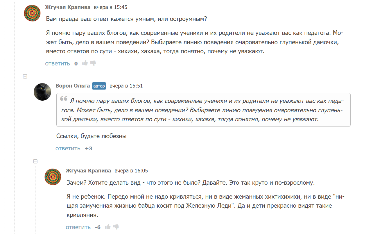 Прошу тех, кто видел у меня эти пресловутые "пару блогов", в которых Я ЖАЛУЮСЬ НА ОТСУТСТВИЕ УВАЖЕНИЯ КО МНЕ У РОДИТЕЛЕЙ И ДЕТЕЙ - дайте, пожалуйста, ссылки. Сама я не помню ни одного такого блога, поэтому искренне не могу понять комментатора и проникнуться его пониманием моей тонкой душевной организации нищей замученной жизнью... и далее по тексту.