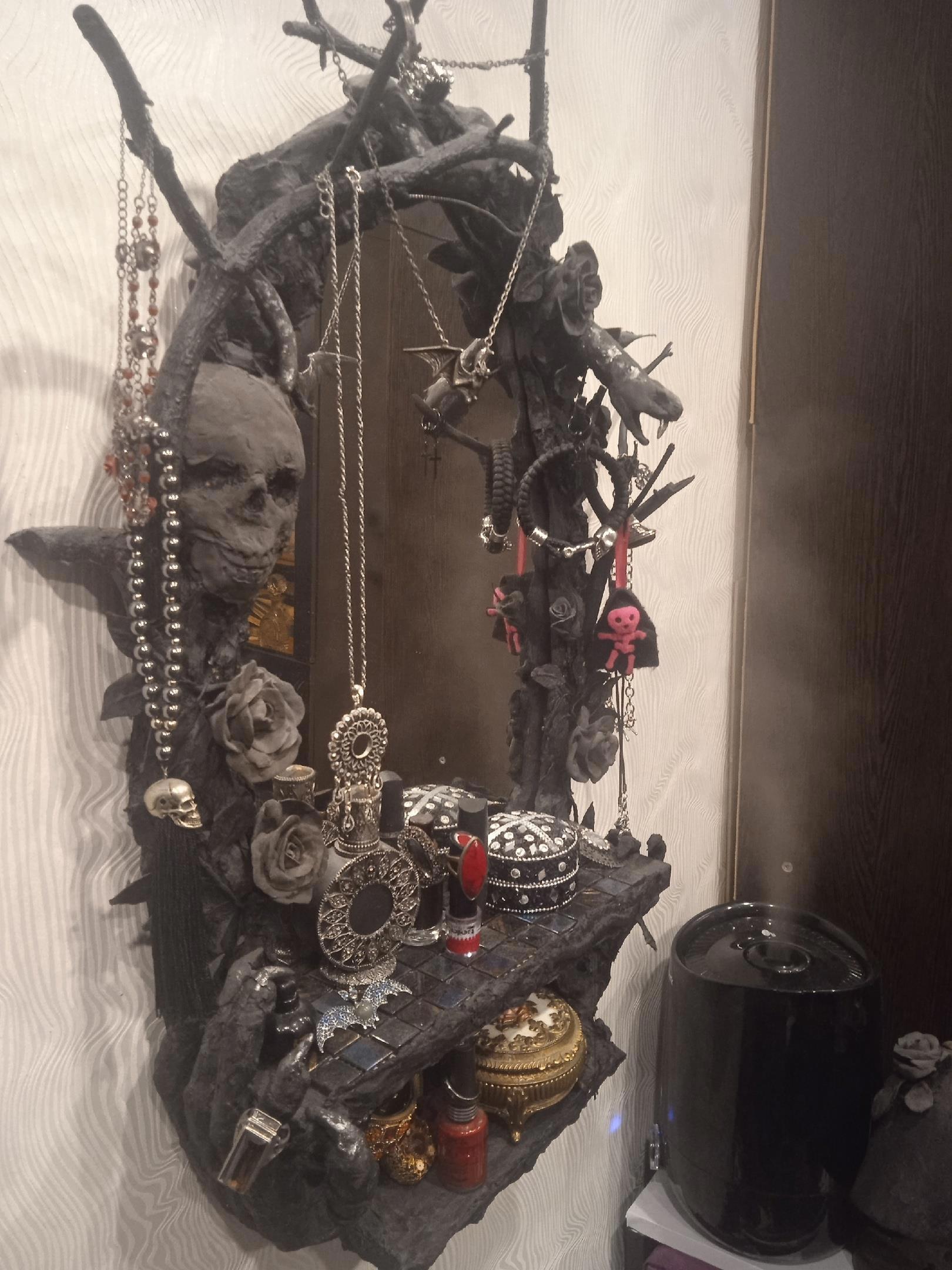 Отдельно хочется остановиться на зеркалах. Я их вообще люблю. Большое зеркало мне досталось в простой овальной раме, я его немного переделала. Всякие листики-розочки-веточки... Васю (это шкелетик наверху) мне подарили - и роль хранителя зеркала ему прекрасно подошла.