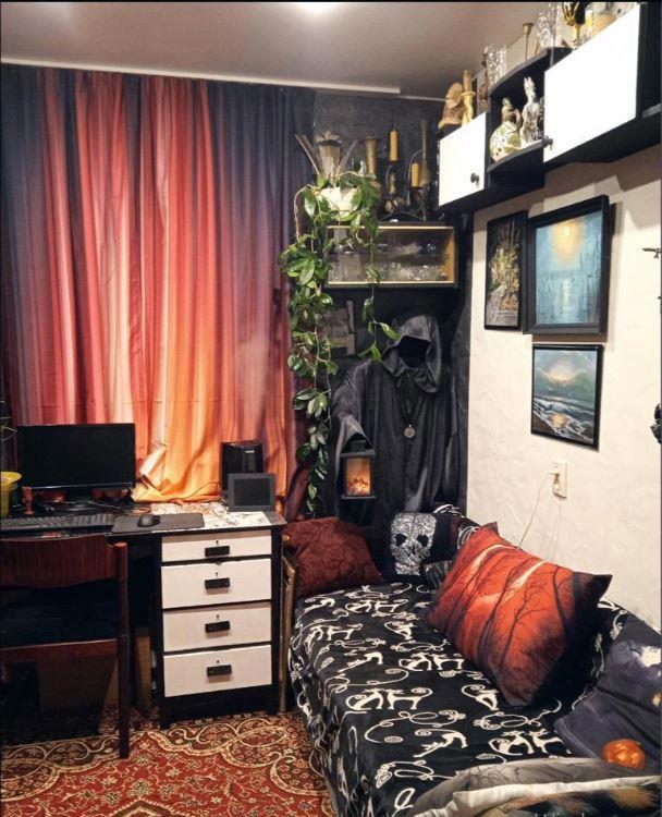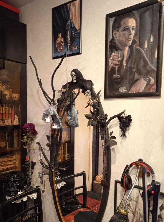 Начинала писать я с вампирского романа. Одна из моих первых читательниц сделала мне замечательный подарок - симпатичного тряпичного Дракулу. Потом... была ещё какая-то мистично-вампирская хрень, но я не помню, честно, и я не виновата, оно само стало собираться! Мне подарили шкатулку - чёрного барана, солонку с перечницей в виде черепушек, шариковые ручки-кости. Это показалось прикольным, и я стала собирать всё такое. На видеокамере лежит летучая мышь, в углу стоит оскаленная тыква, в другом - безликая фигура в чёрном плаще с капюшоном, на стене - портрет вампира, на окне - чёрный тюль с переплетением паутины с кромкой из летучих мышей, под мышкой коврик с гостеприимно раскрытым гробом и т.п, а уж количество разных черепов на единицу площади вообще зашкаливает.