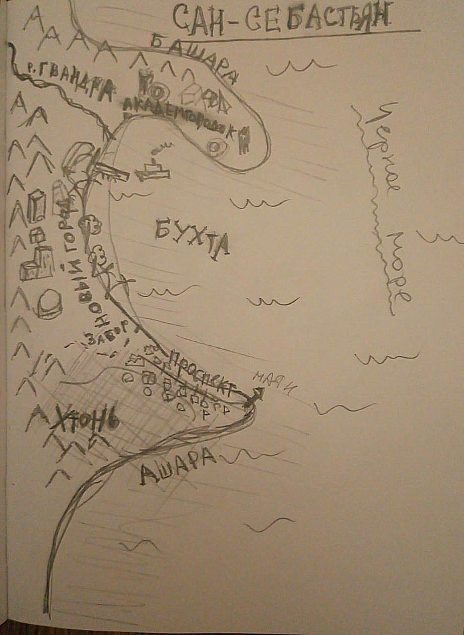 Автор: Евгений КапбаДля начала - тут просили карту Сан-Себастьяна, я сказал мол - у меня каракули намалеванные карандашом, мне сказали - а давай. Ну, нате))