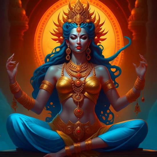 Это, понятное дело, индийская богиня; раз кожа синевой отливает, то явно супруга Шивы, а без ожерелья из черепов получается Дурга.