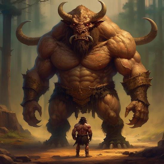 Конан против Минотавра. Подозреваю, что Конан победит, потому что Минотавр явно не видит своего соперника.