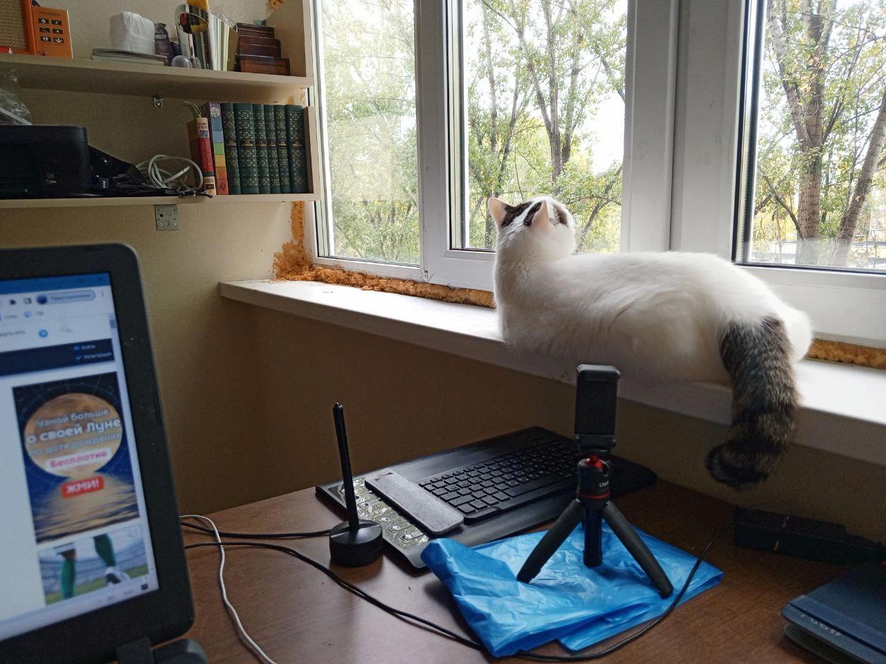 Так как мне в первую очередь важен был фон и интернет, то всё удачно совместилось разворотом стола. Плюс теперь не слепит свет и не дует в спину, что не может не радовать. Ну, и конечно куда же без кота.