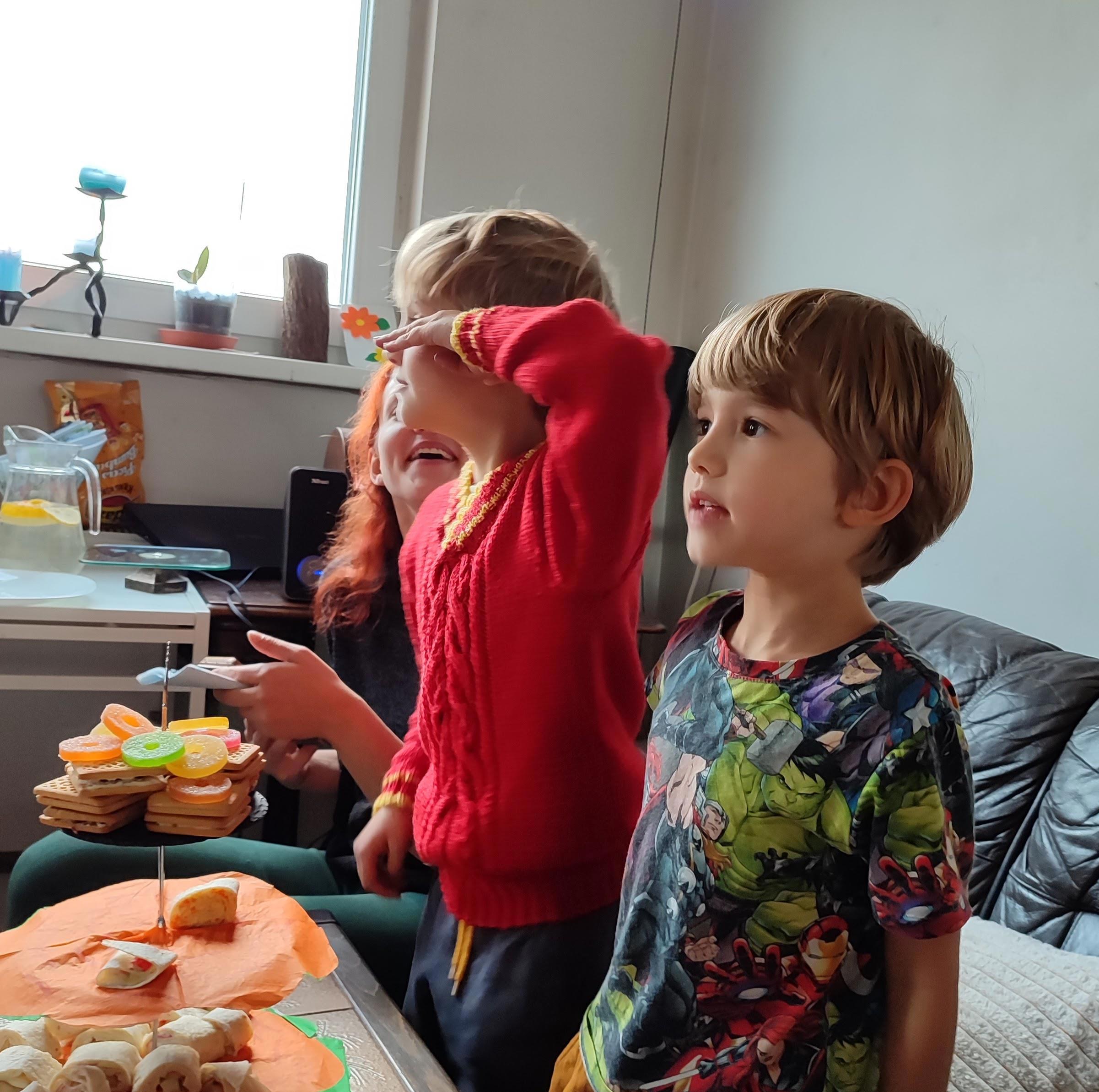 На переднем плане - младший, Артур. Он свой свитер еще в июле получил. Но ему и так не холодно.