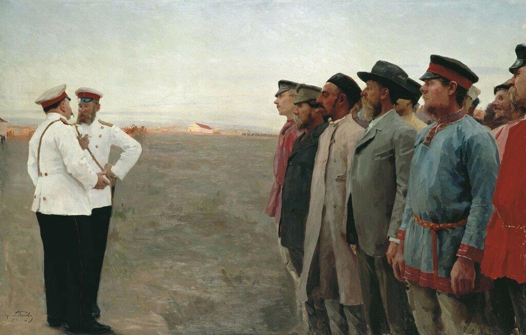Автор картины которую вы видите выше художник Попов Лукиан Васильевич. Картины называется "Взяты" ("Мобилизованы") и написана ещё в 1904 году. Эх, какая красота, да? Жизненно, до мурашек по спине. Прямо заставляет остановиться и разглядеть внимательно этих мужчин разных профессий, разного возраста призванных в армию. А ведь у них семьи, пожилые родители, планы на будущие, в конце концов. Художник знал о чём рисовал потому что в 1876 году, после введения всеобщей воинской личной повинности его отца призывают на службу в армию, и семья переезжает в Оренбург.